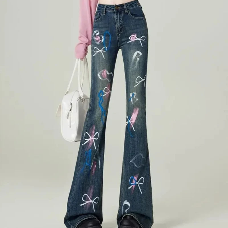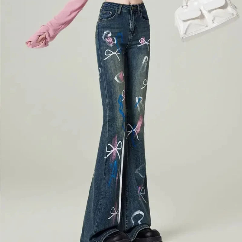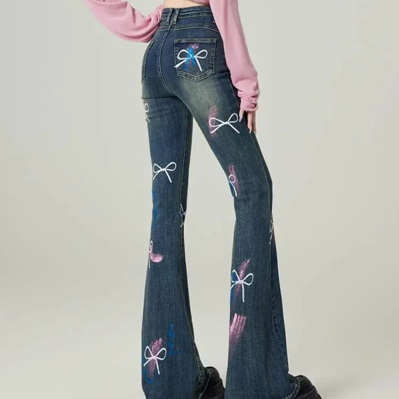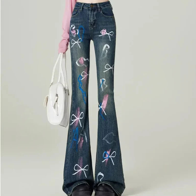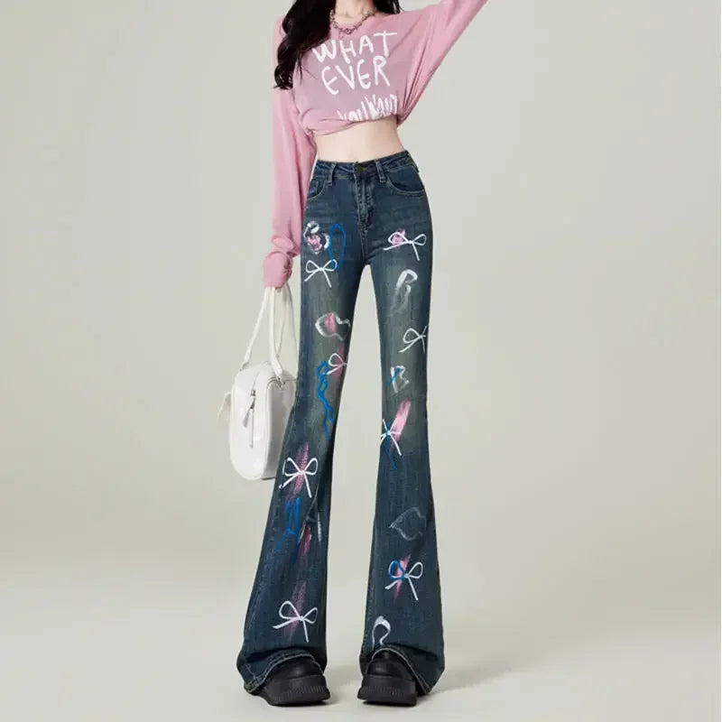 Purpdrank Graphic With Print Flare Trousers Pattern Womens Flared Jeans High Waist Shot Fitted Trend 2025 Unique R Z Denim Pants for Women