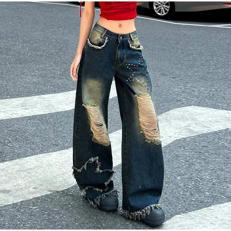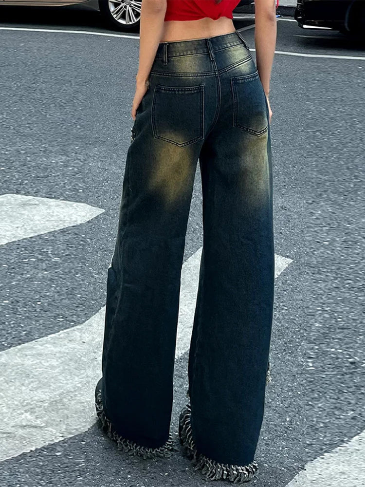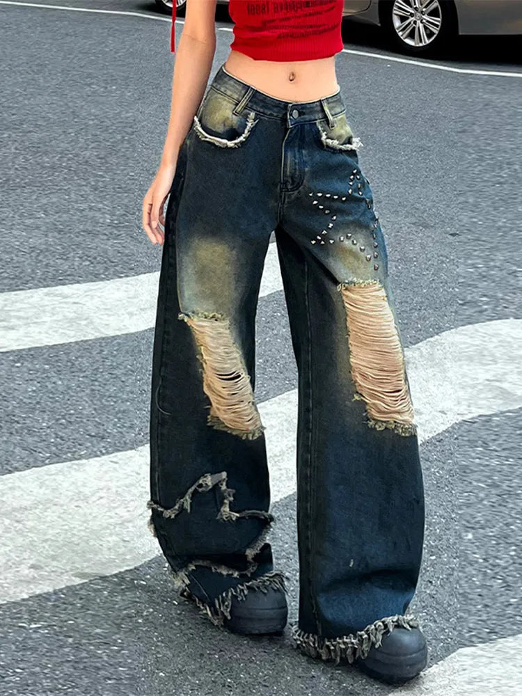 Purpdrank High Street Denim Women's Long Trousers Retro Star Hollow Out Female Wide-leg Trousers Vintage High Waist Pockets Lady Pants