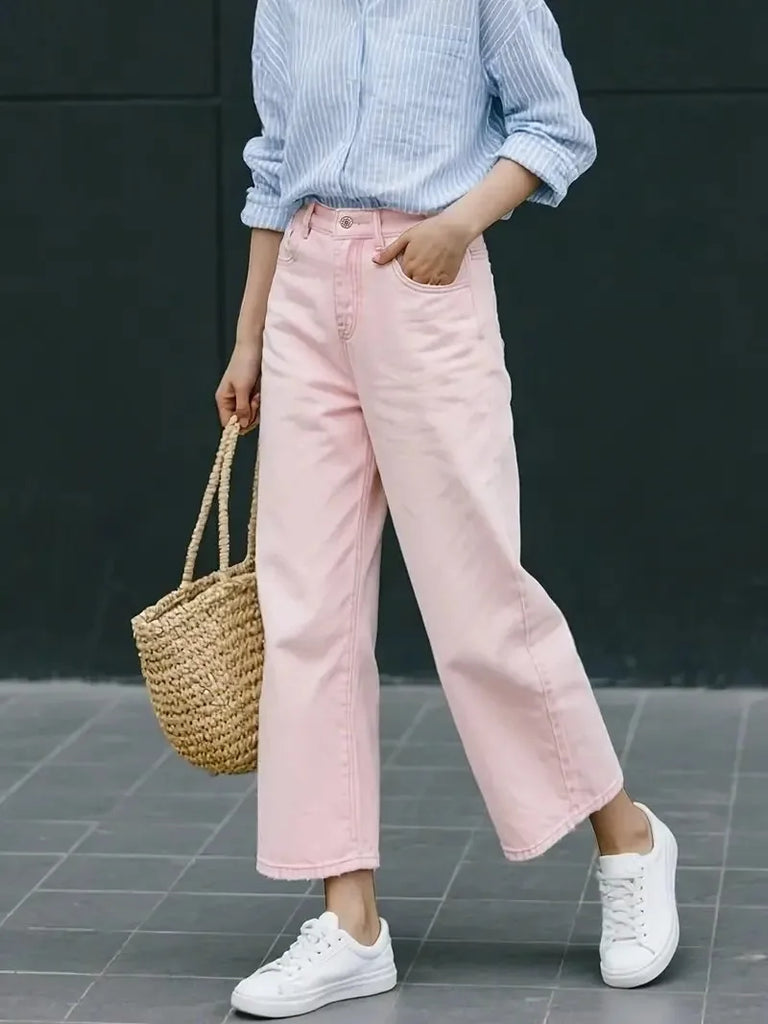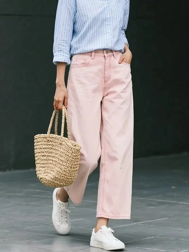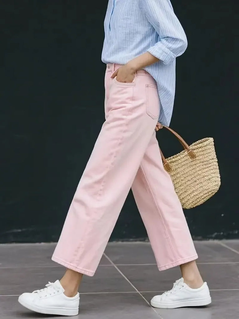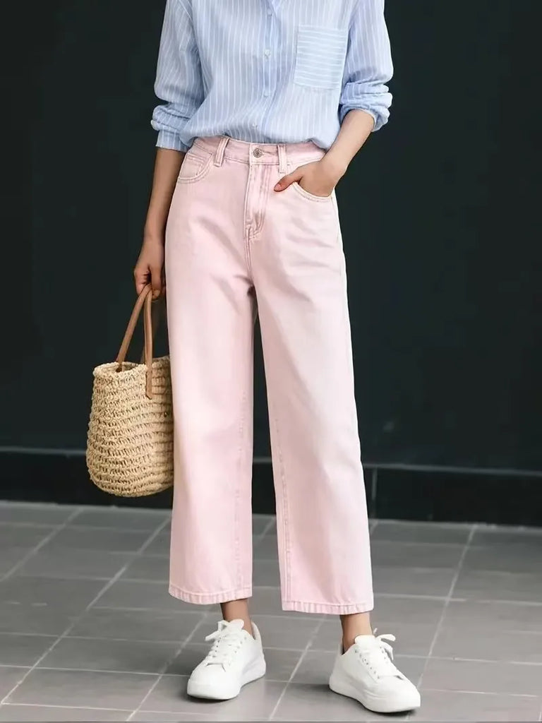 Purpdrank Women's Pink Nine-Part Jeans, Straight Leg, Casual, Versatile, Slimming, Non-Stretch, Mid-Rise, Wide-Leg Denim Pants