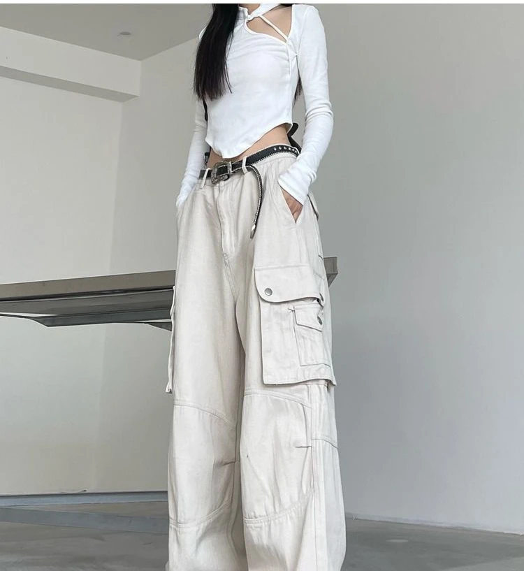 Purpdrank - Techwear Harajuku Beige Cargo Jeans Women Retro Streetwear Oversize Black Wide Leg Denim Pants Female Y2K Hippie Trouser
