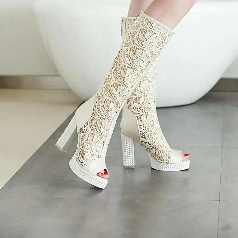 Purpdrank Ladies Summer Boots Peep Toe Chunky Heels Lace Mesh Splice Big Size 33-43 Black Whiete Fashion Sexy S4036