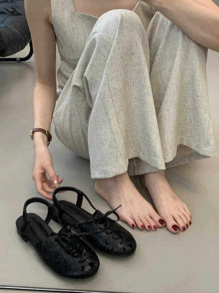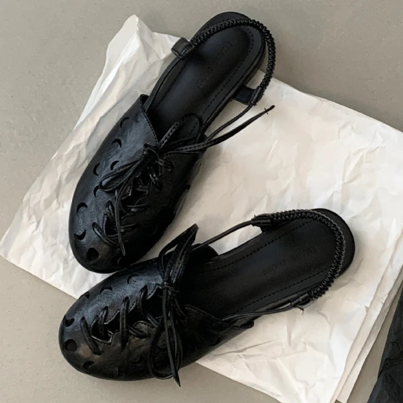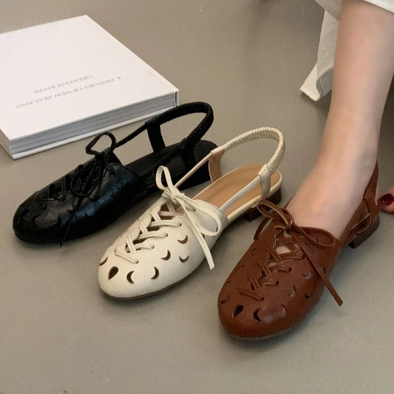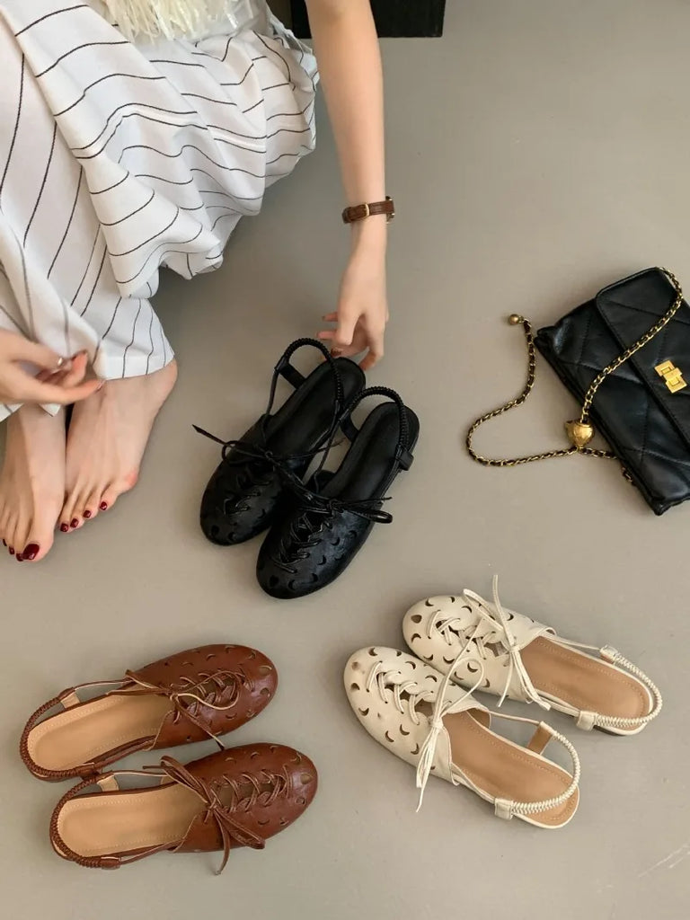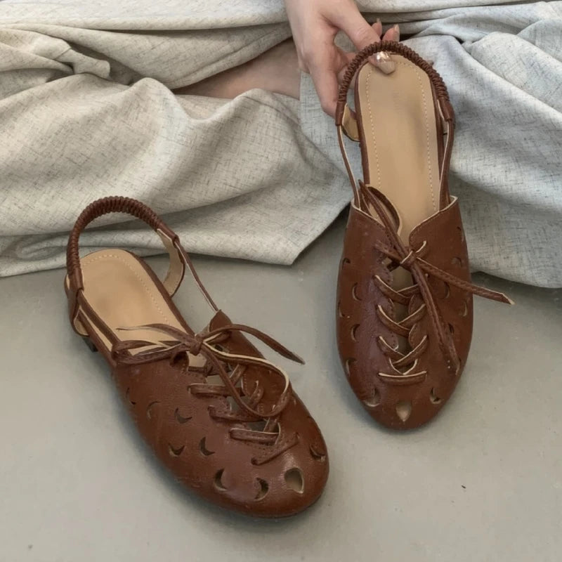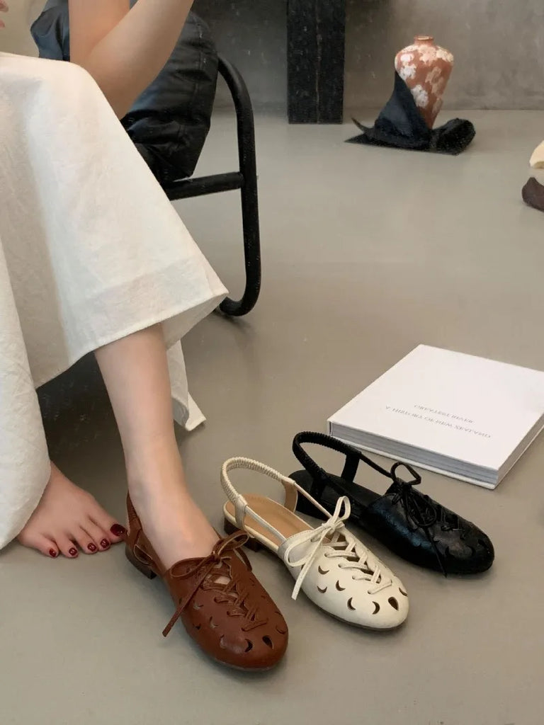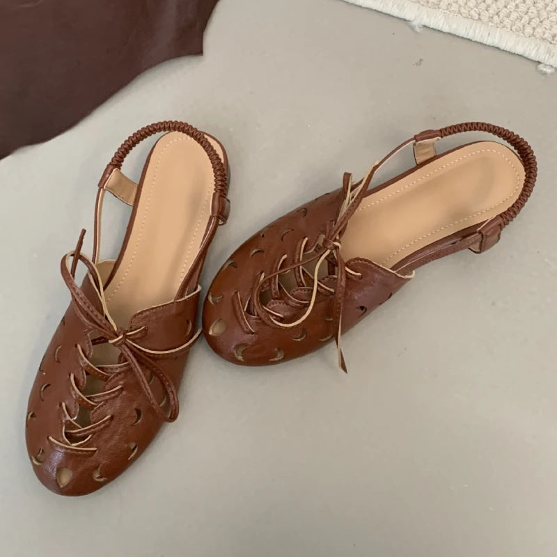 Purpdrank Retro Hollow Lace-up Low Heel Pumps Women Fashion Roman Style Brand Designer Shoes Comfortable Round Toe Back Strap Casual Shoes