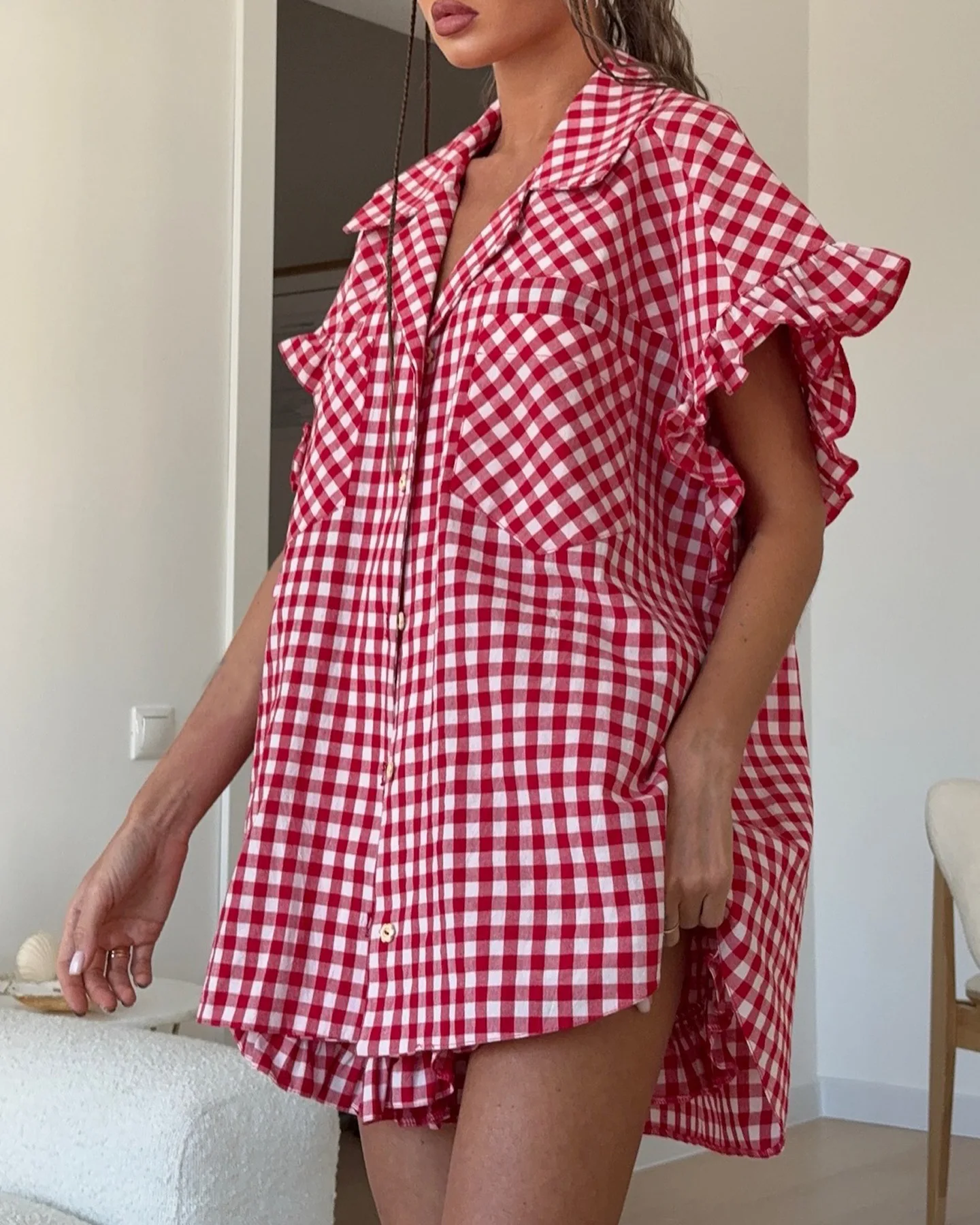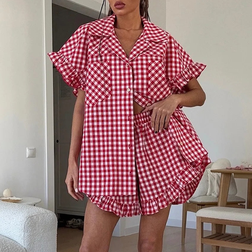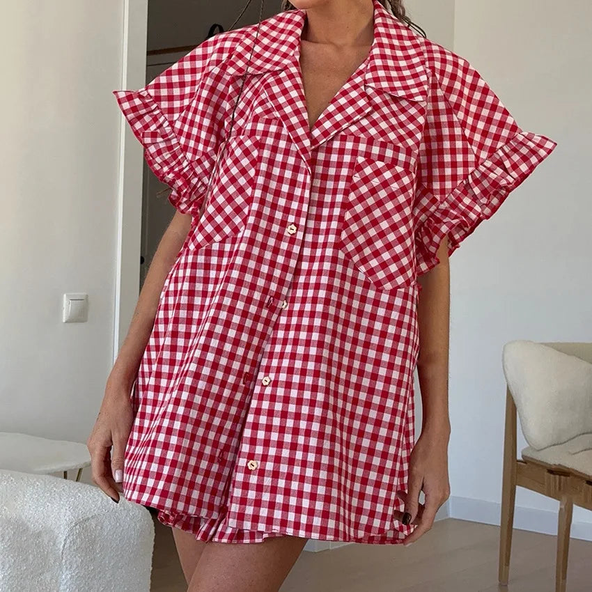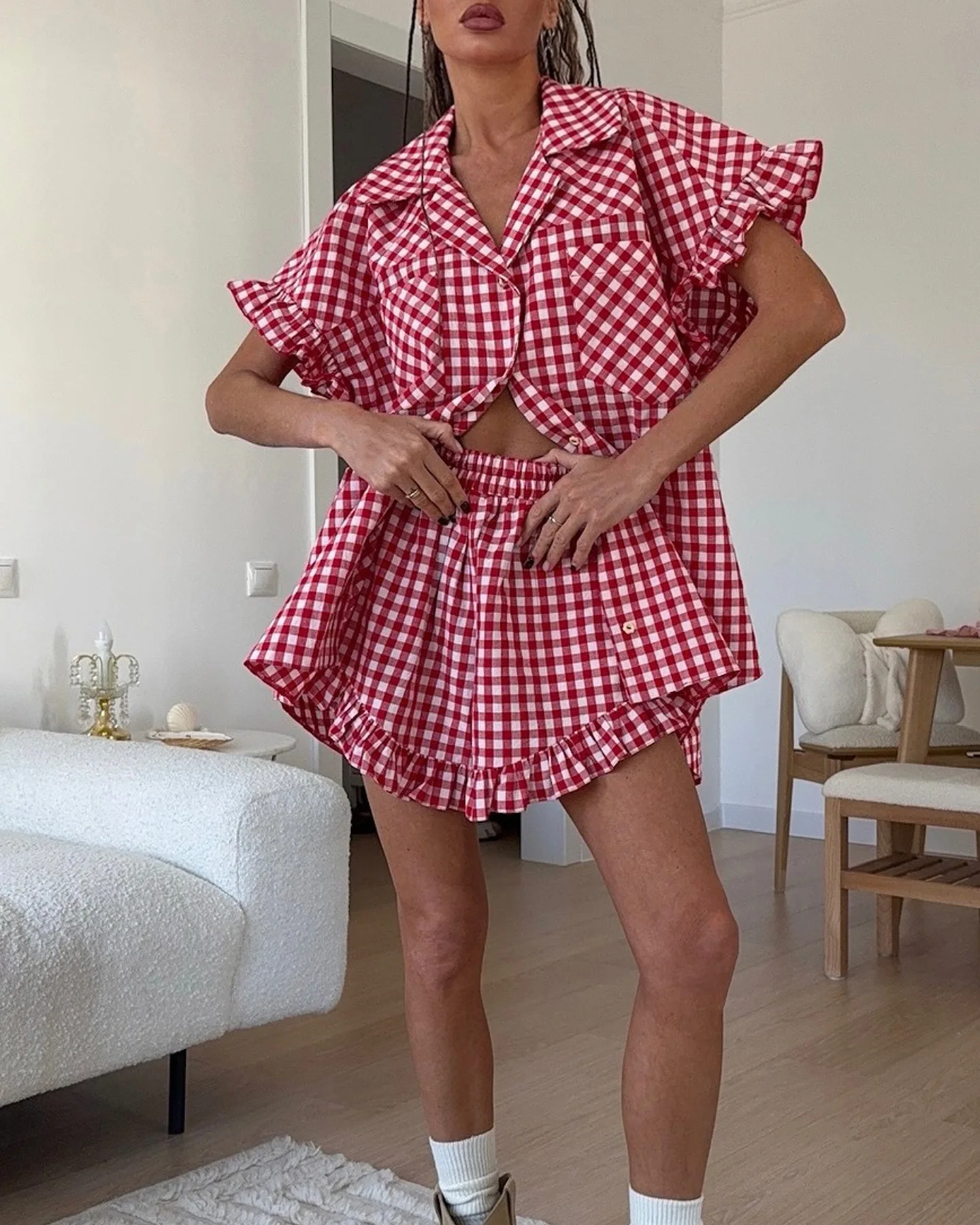 Purpdrank Lotus Leaf Edge Fashionable Casual Plaid Shirt High Waisted Shorts Set for Women 2025 Summer New Item