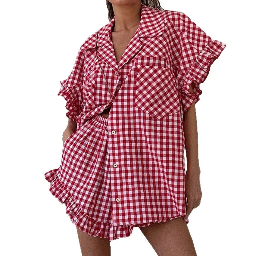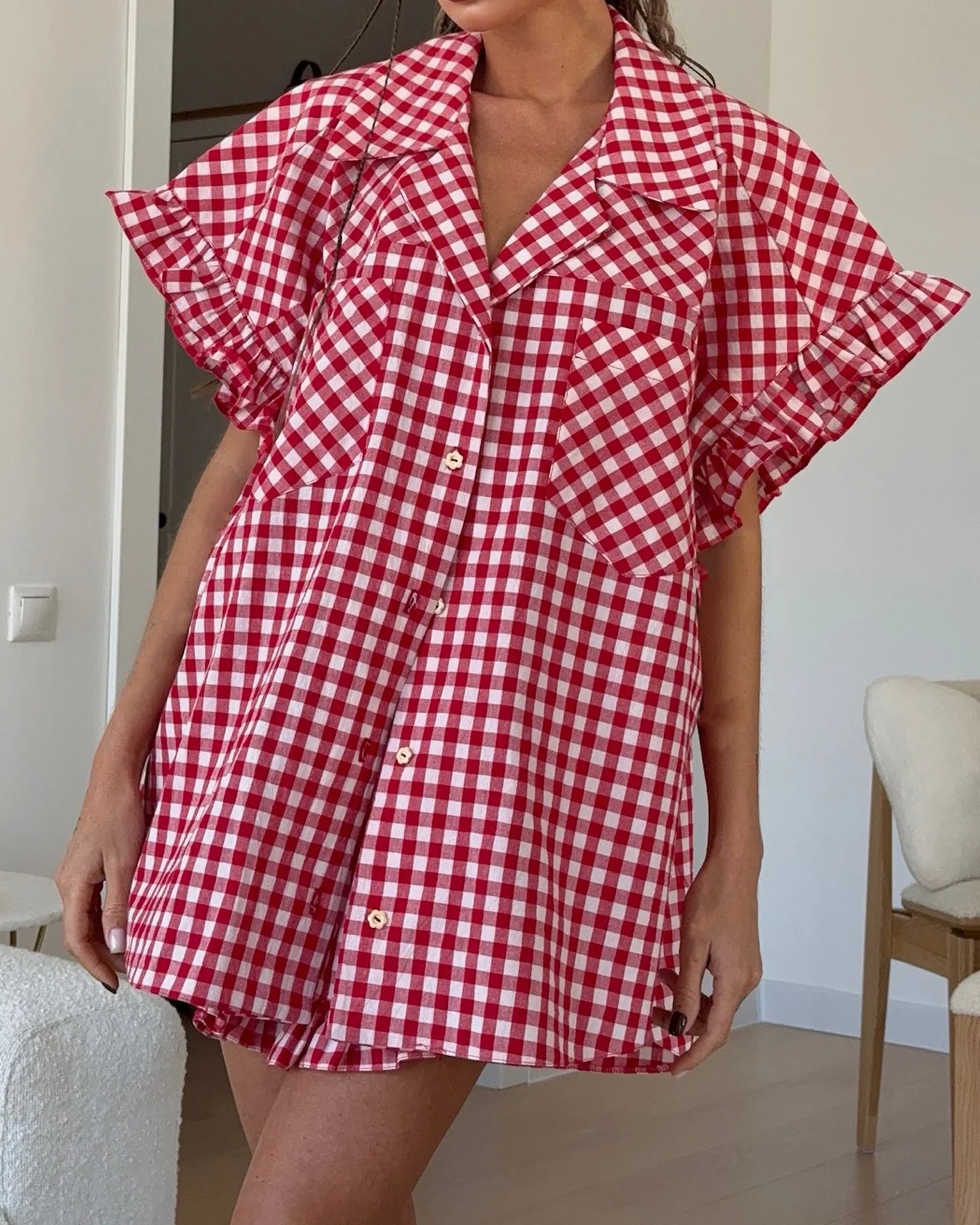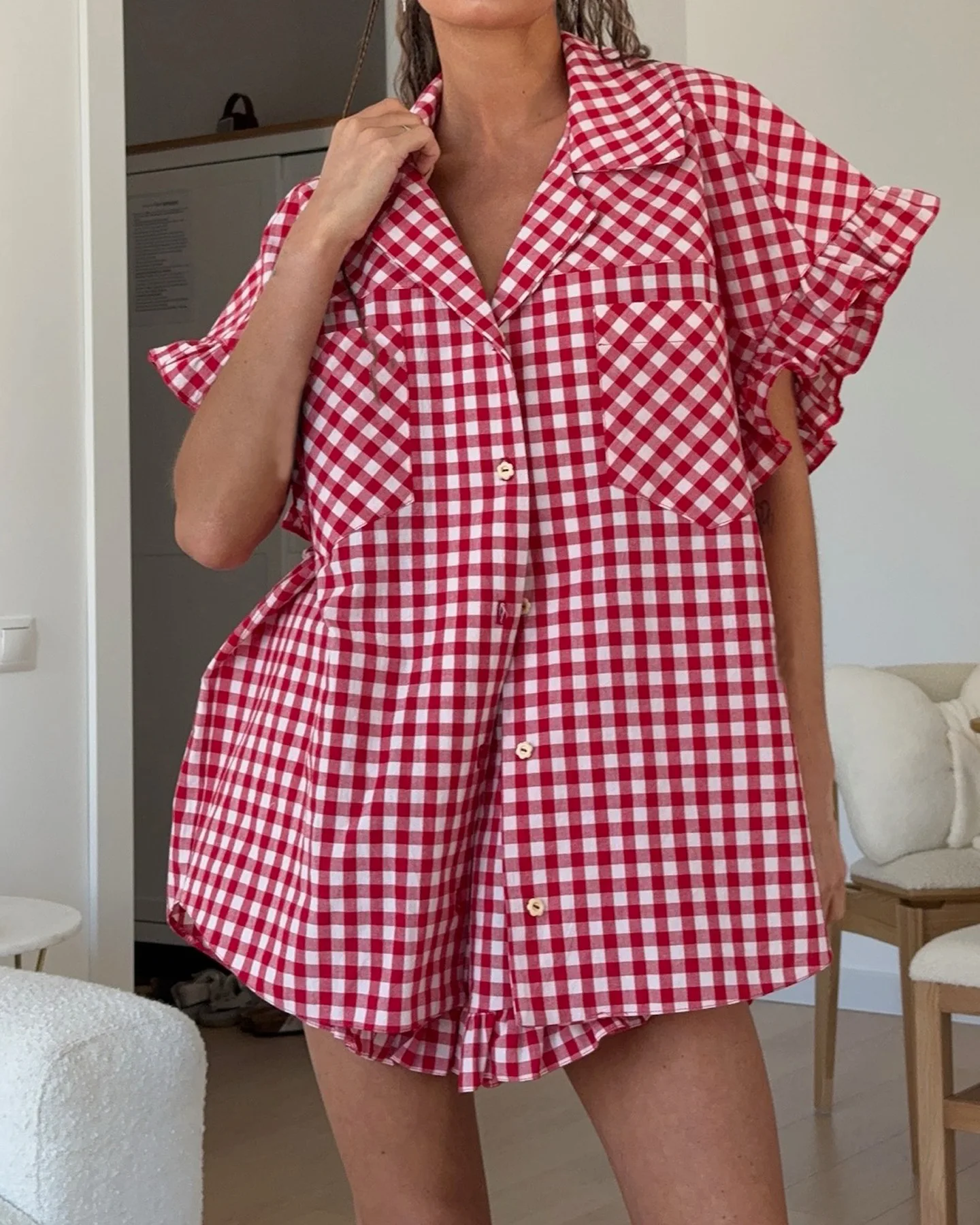 Purpdrank Lotus Leaf Edge Fashionable Casual Plaid Shirt High Waisted Shorts Set for Women 2025 Summer New Item