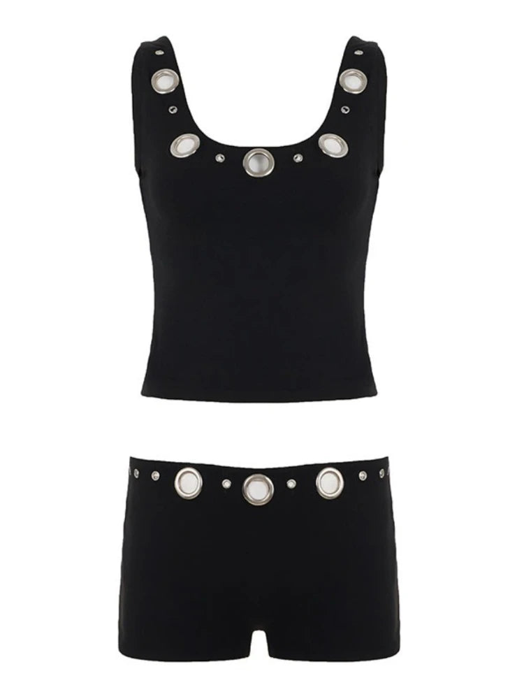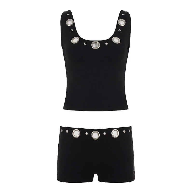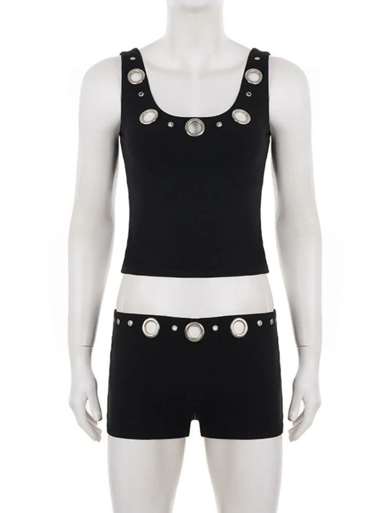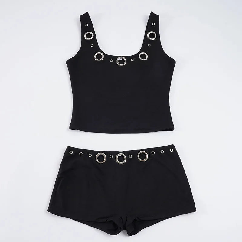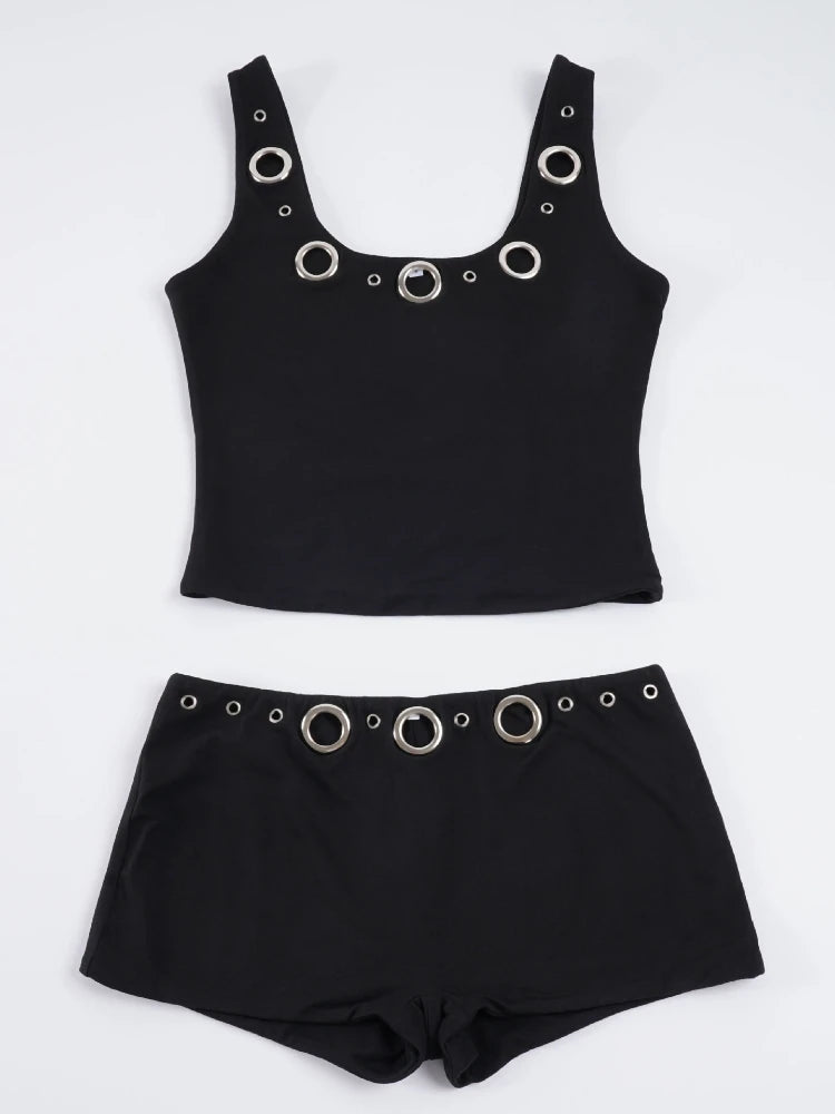 Purpdrank Street Style 2-Piece Set Sexy Metal Eyelet U-Neck Sleeveless Tank Top and Low Rise Slim Shorts Women Casual Sporty Outfit