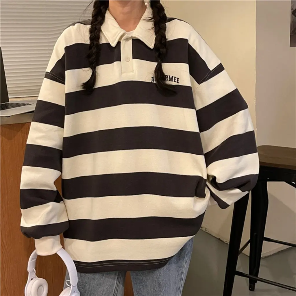 Purpdrank Japanese Striped Polo Shirt Sweater for Women Loose Korean Style Spring Autumn Casual BF Salt Coat