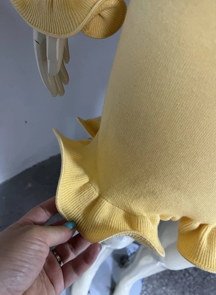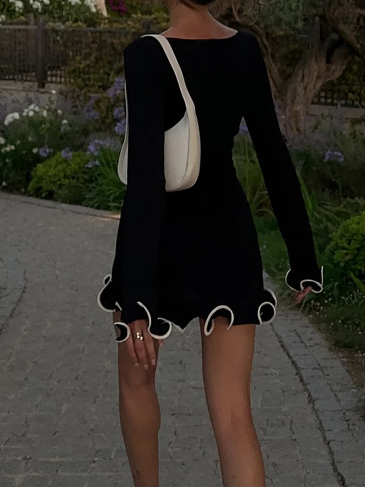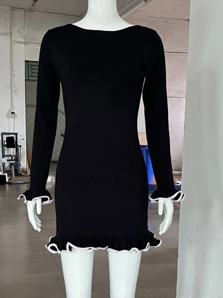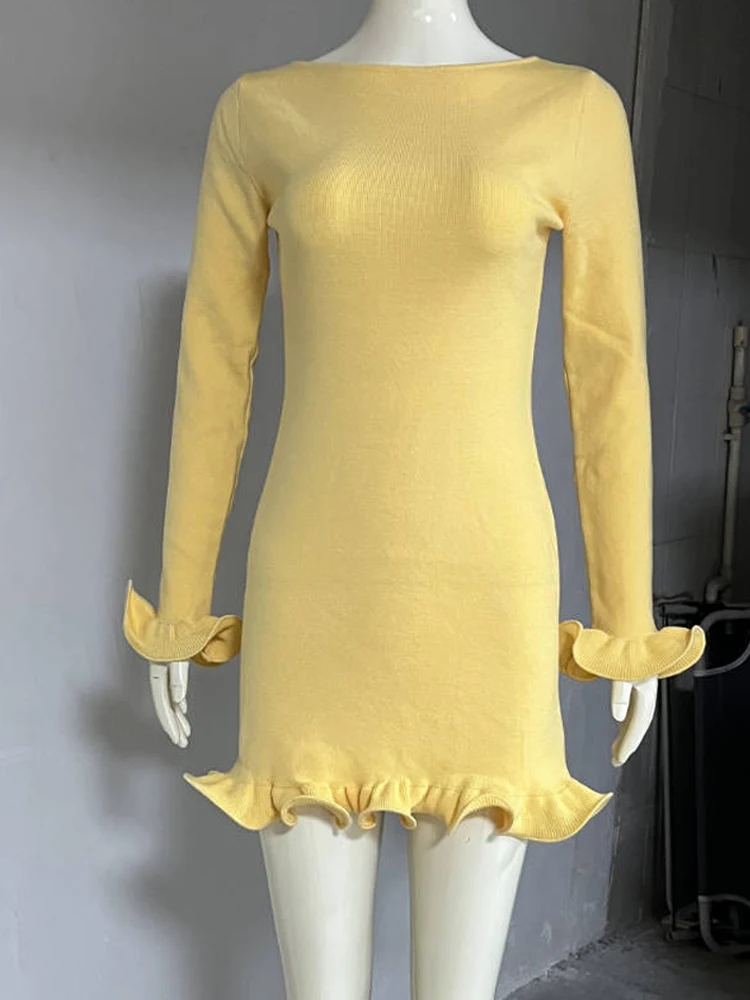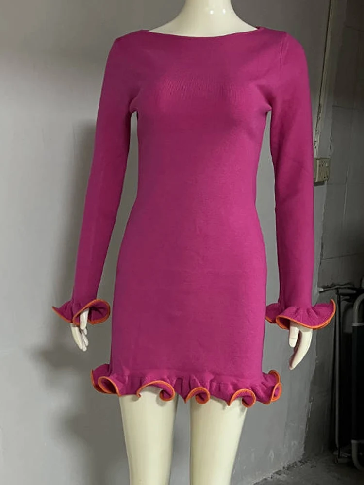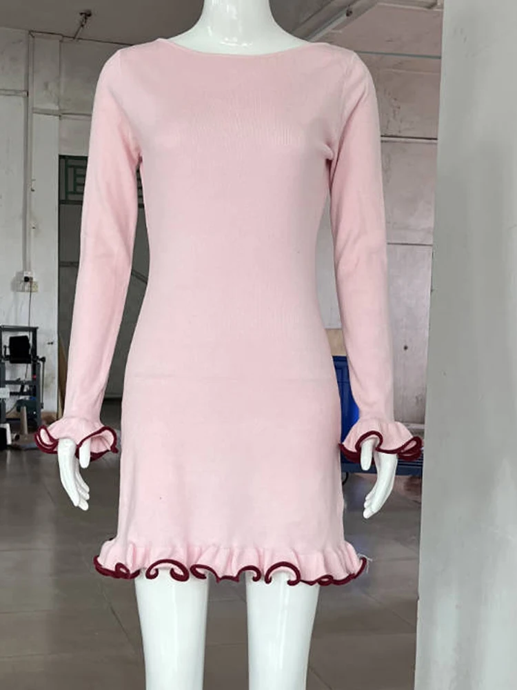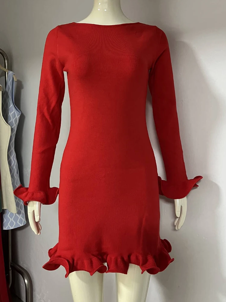 Purpdrank New Winter Knitted Dresses for Women Autumn Fashion Slim O-Neck Flare Sleeve Sexy Wave Ruched Sweater Dress Ladies Y2K Mini
