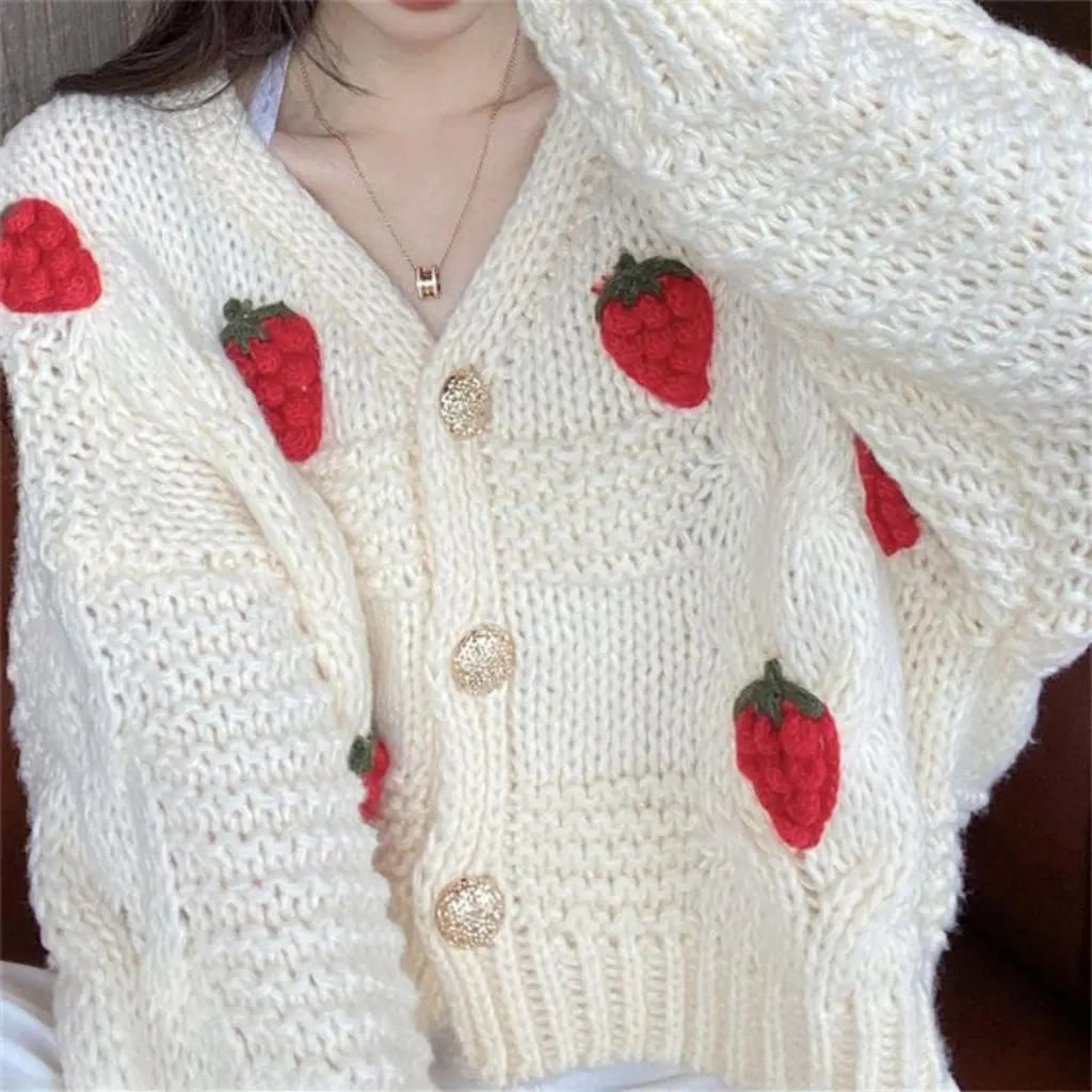 Purpdrank Women's Retro Sweet Strawberry Knitted Cardigan V-Neck Loose Lazy Style Spring Autumn Winter Sweater Jacket