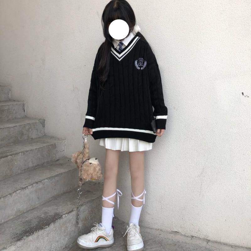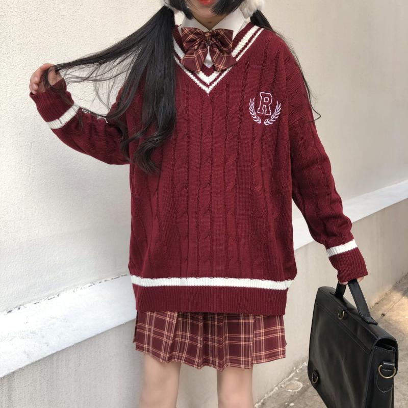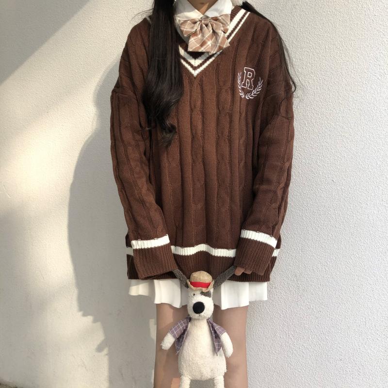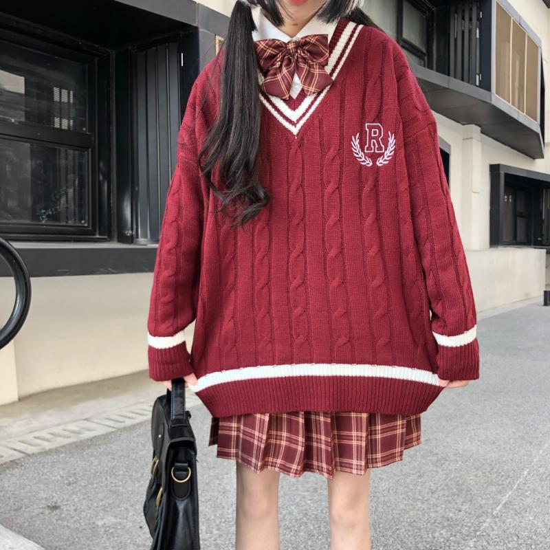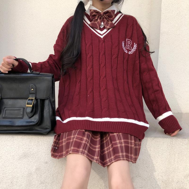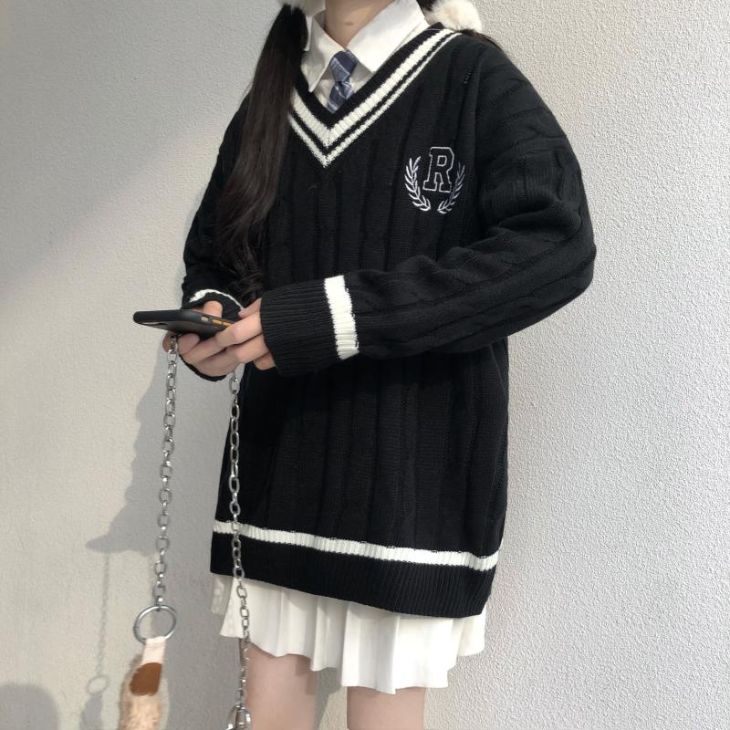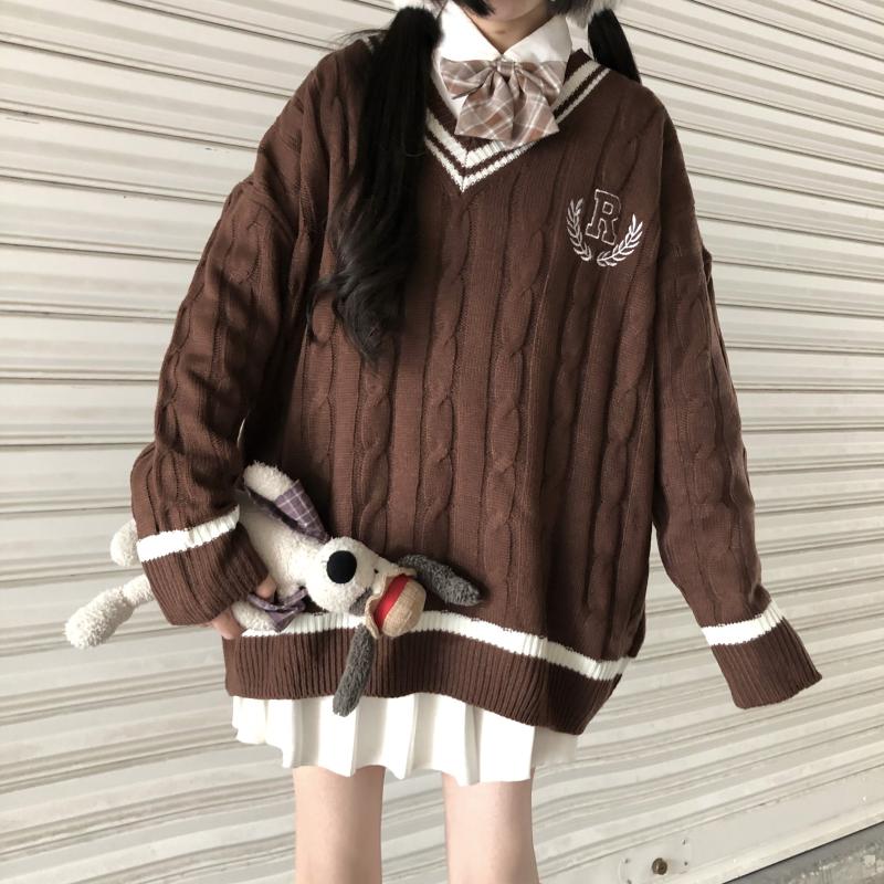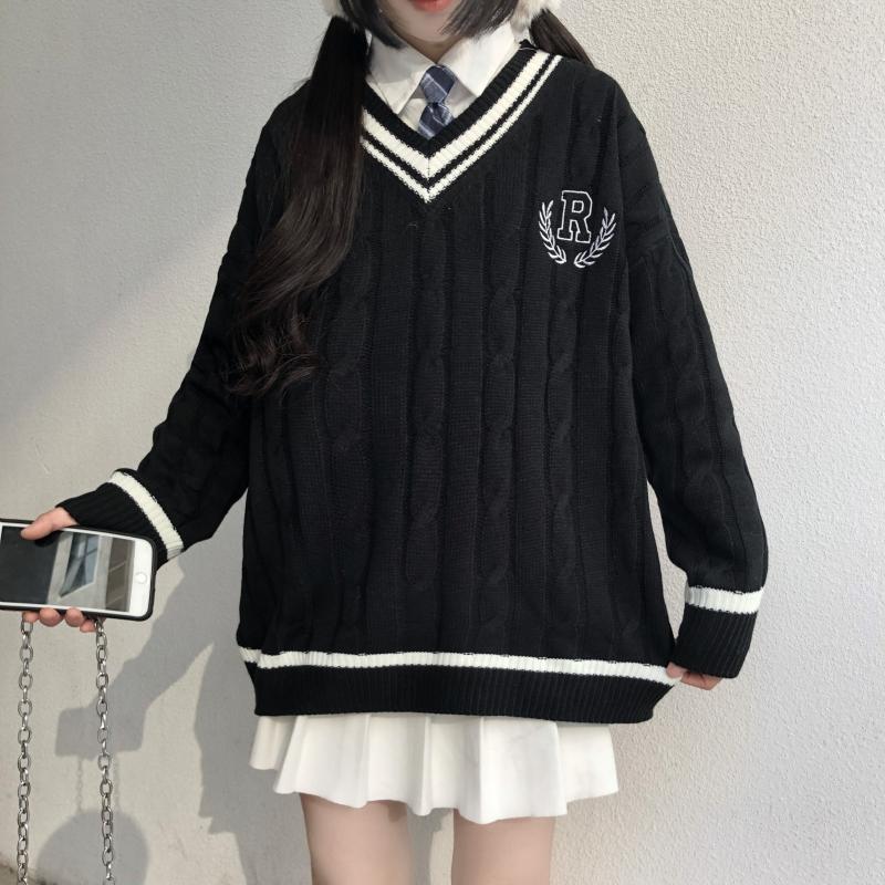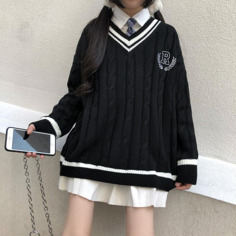 Purpdrank - New Japanese Wear Pullover Jk Sweater Loose V-Neck Regular Long SleevesStudent Hollow Out Knitting Loose Women Pullover