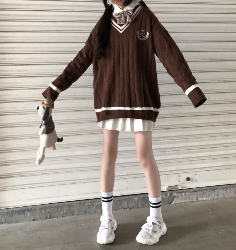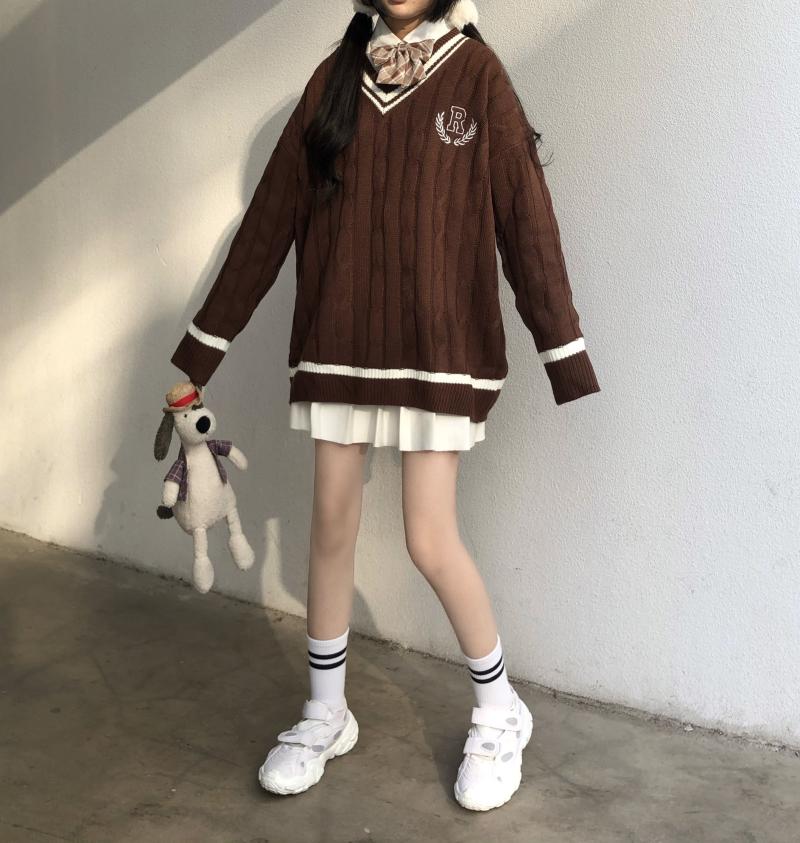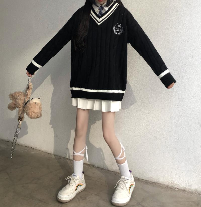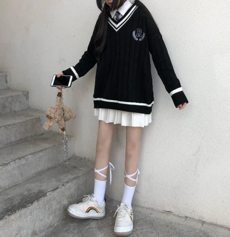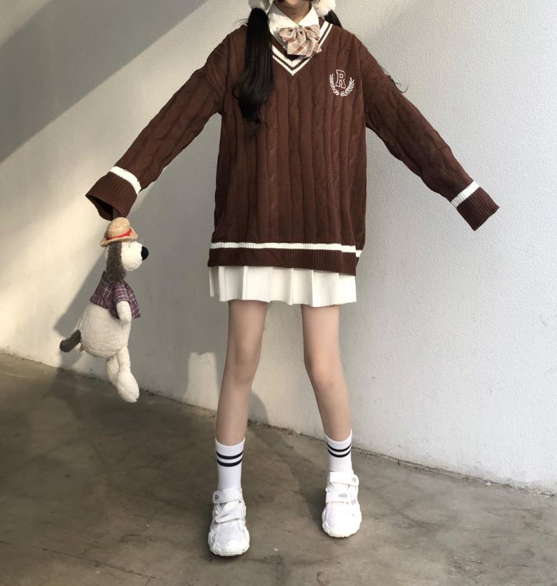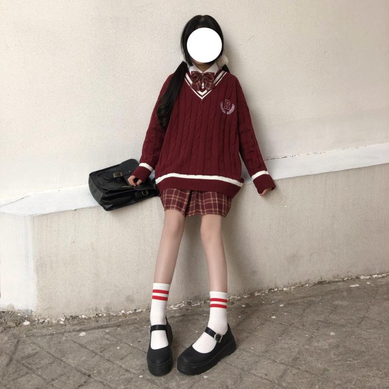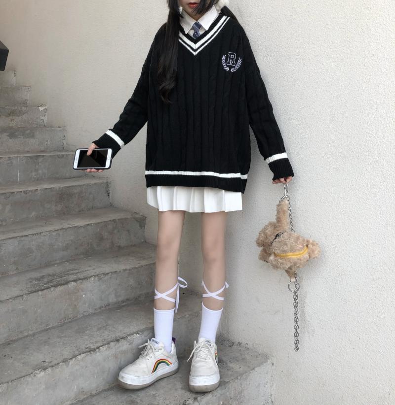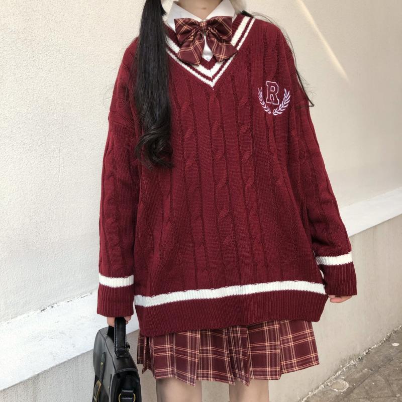 Purpdrank - New Japanese Wear Pullover Jk Sweater Loose V-Neck Regular Long SleevesStudent Hollow Out Knitting Loose Women Pullover