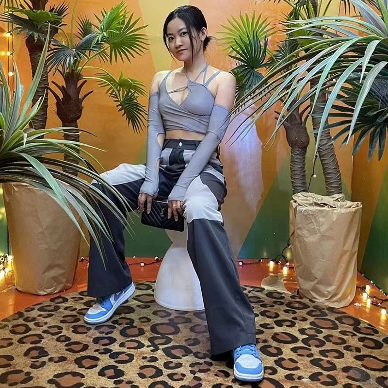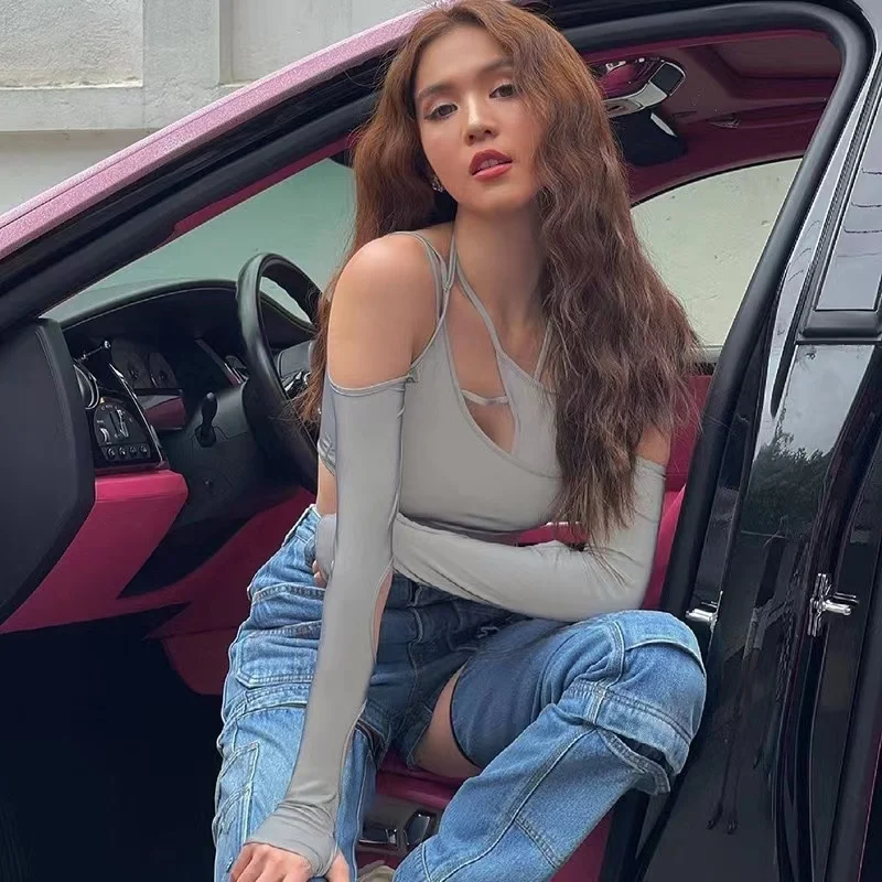 Goth Dark Cyber Y2k Techwear Punk Women Halter Tops Gothic egirl Patchwork Long Sleeve Crop Top Sexy Cut Out Casual T-shirts