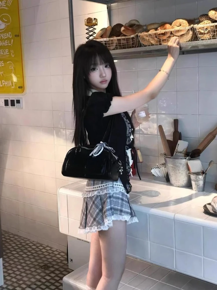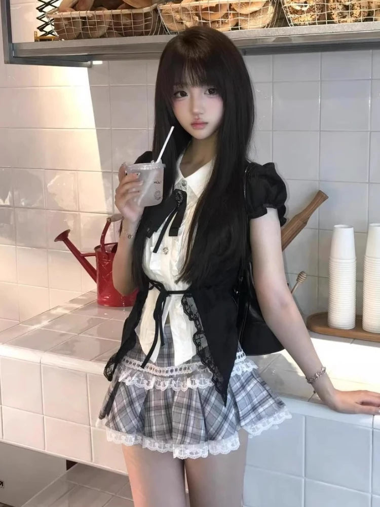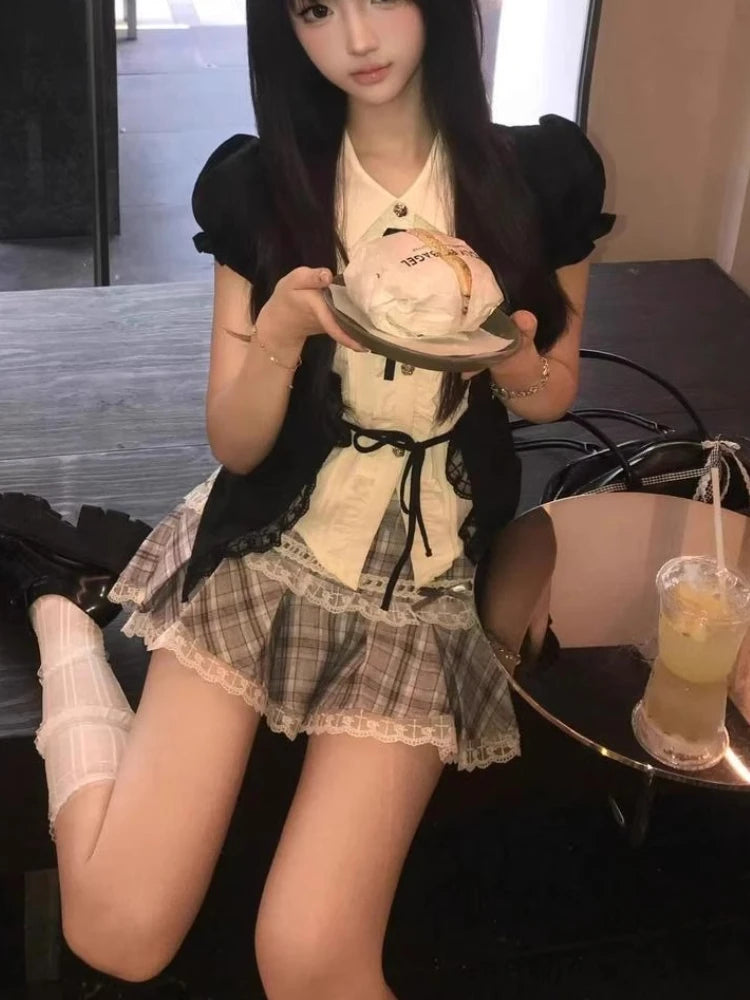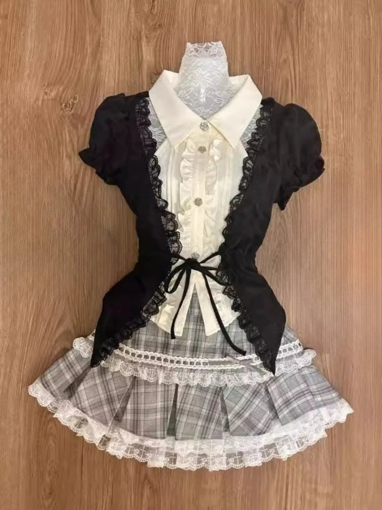 Purpdrank Harajuku Summer Women 2 Piece Set Gothic Lace Slim Tops + Elastic Plaid Short Skirt Female Retro High Street Y2k Design Outfits