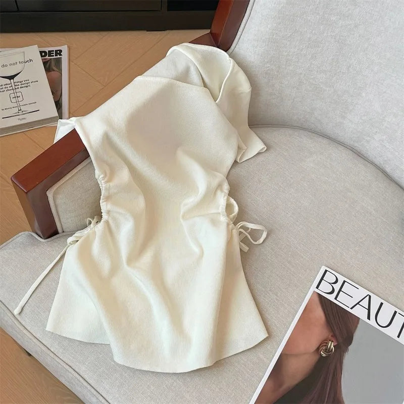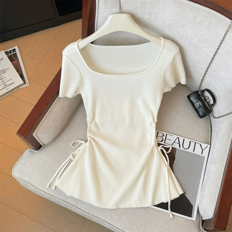 Purpdrank Korean Pleated Square Collar T Shirt Women Summer New Fashion Drawstring Knitting Tops Korean Chic Slim Folds Female Tees