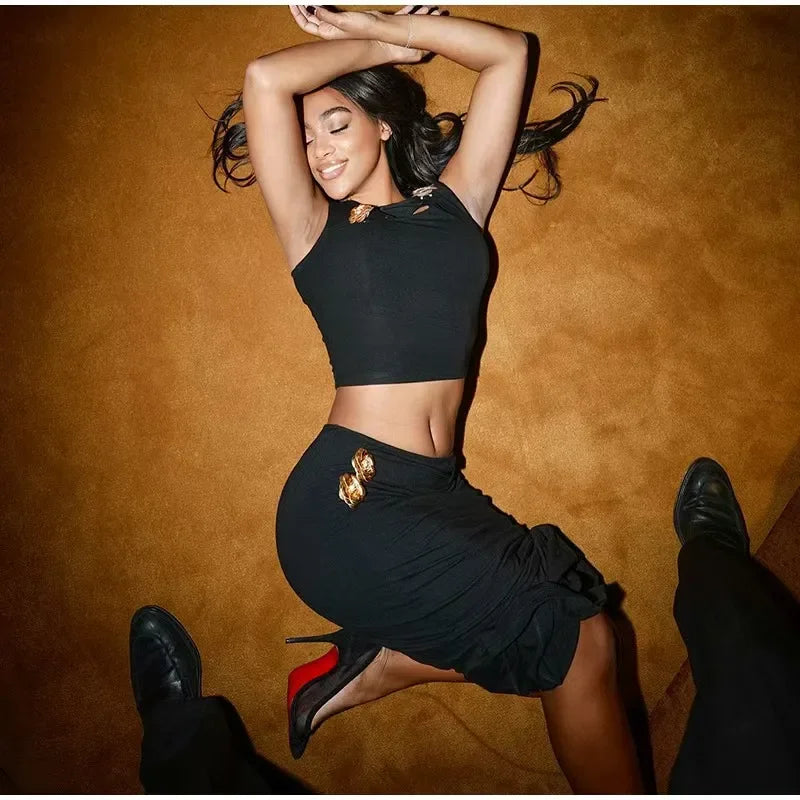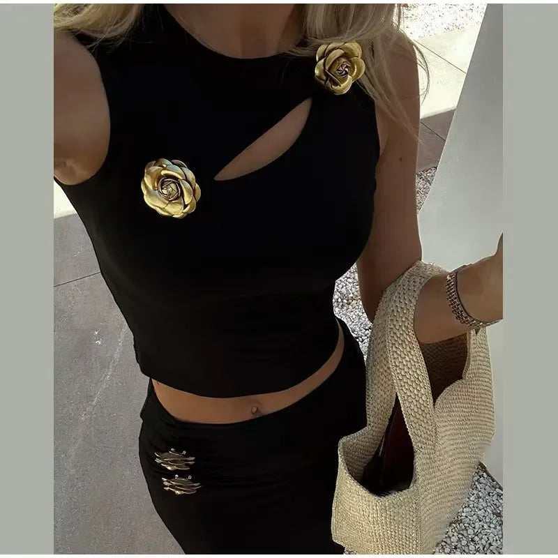 Purpdrank Luxury 3D Metal Flower Women Two Piece Set Hollow Out Sleeveless Slim Cropped Tops High Waist Maxi Skirt Party Vacation Suits