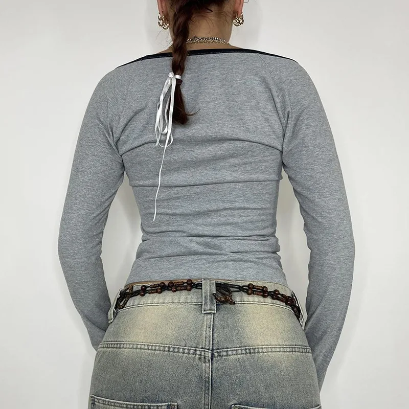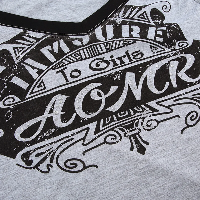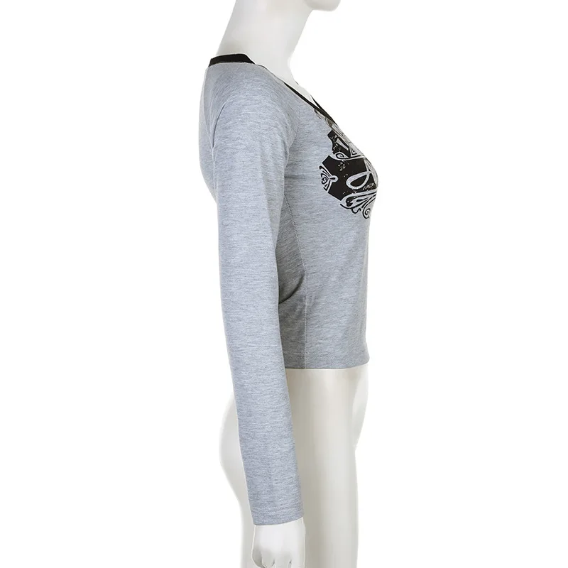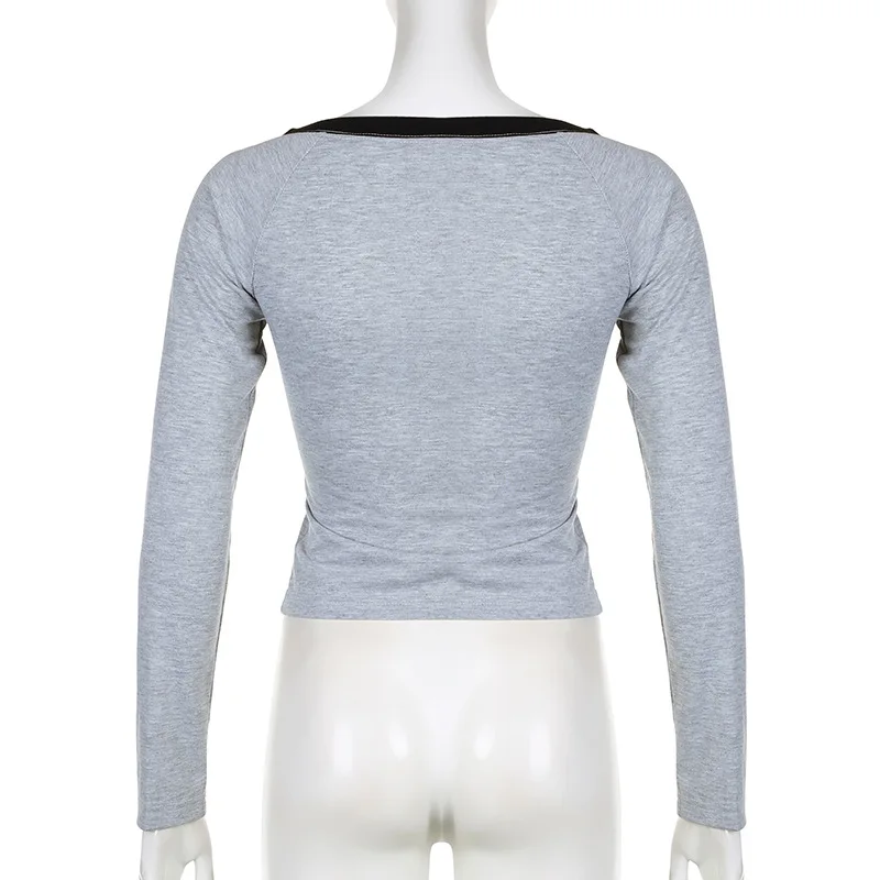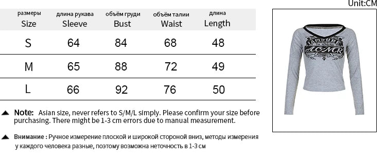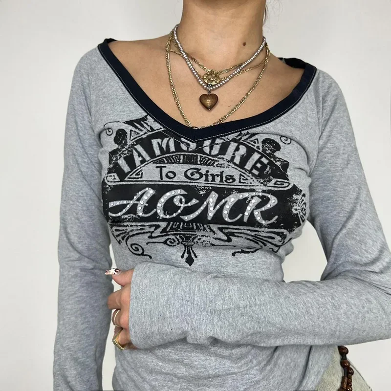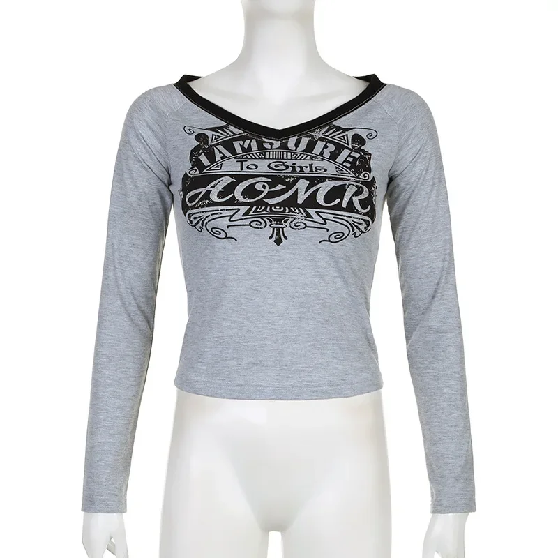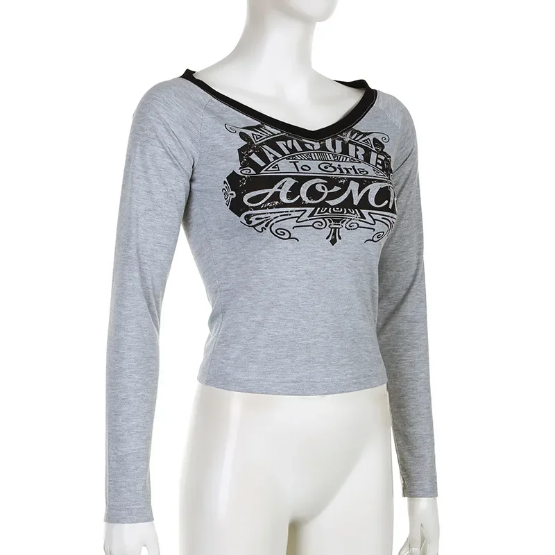 Purpdrank Spring Grey Women's T-shirt V-Neck Long Sleeves Letter Print Crop Top Casual Fashion T Shirt Female Streetwear Sexy Cropped Tops