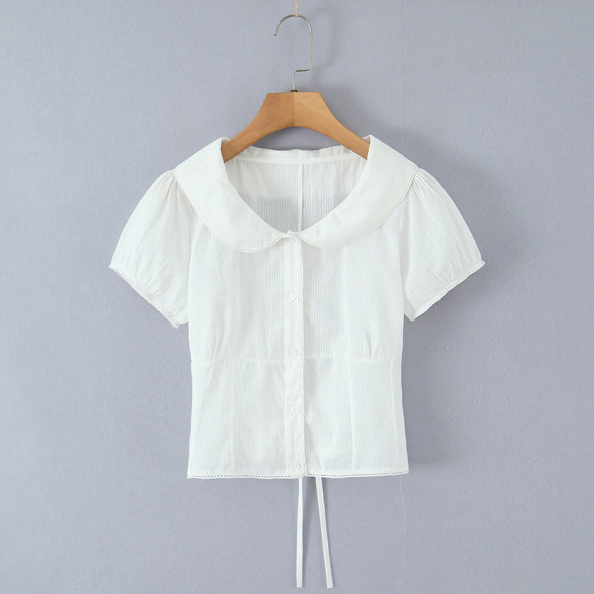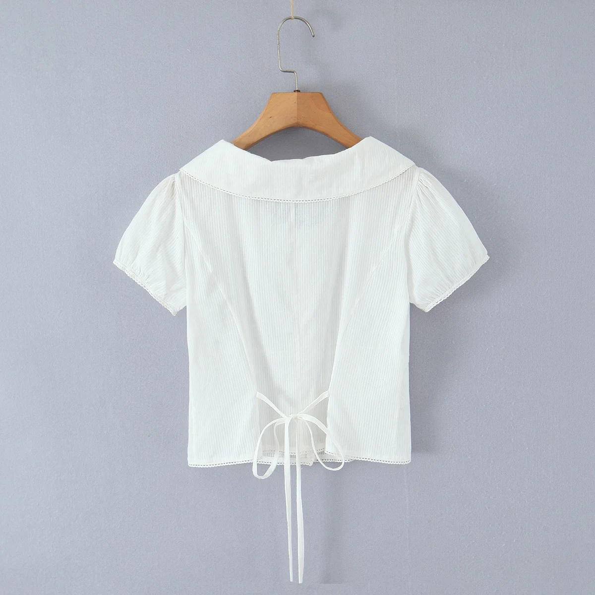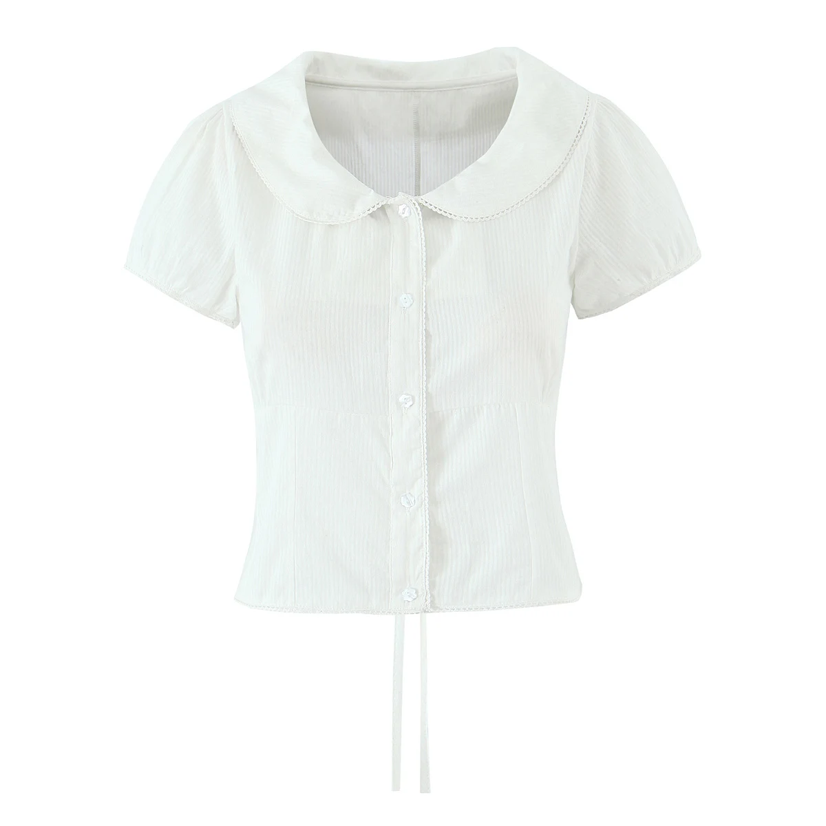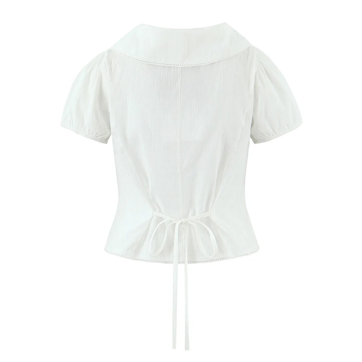 Purpdrank Stylish White Peter Pan Collar Short Puff Sleeve Shirt Women Lacing up Bandage Back Open Buttons Loose Blouse Crop Tops
