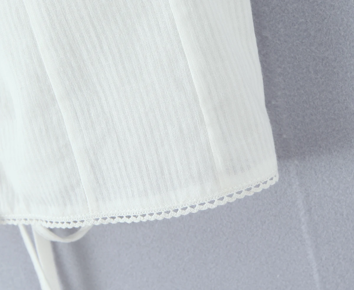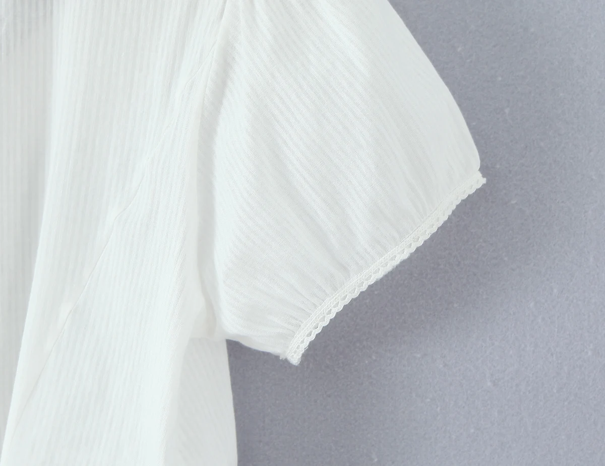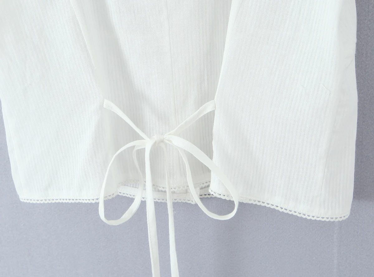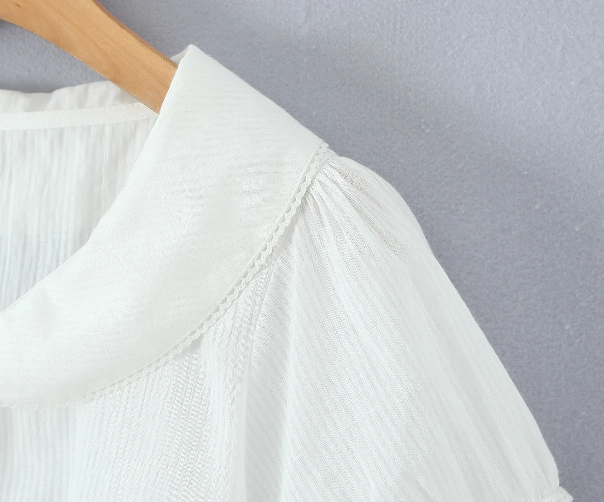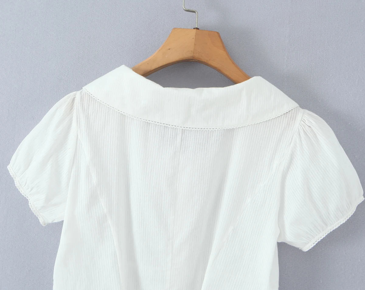 Purpdrank Stylish White Peter Pan Collar Short Puff Sleeve Shirt Women Lacing up Bandage Back Open Buttons Loose Blouse Crop Tops