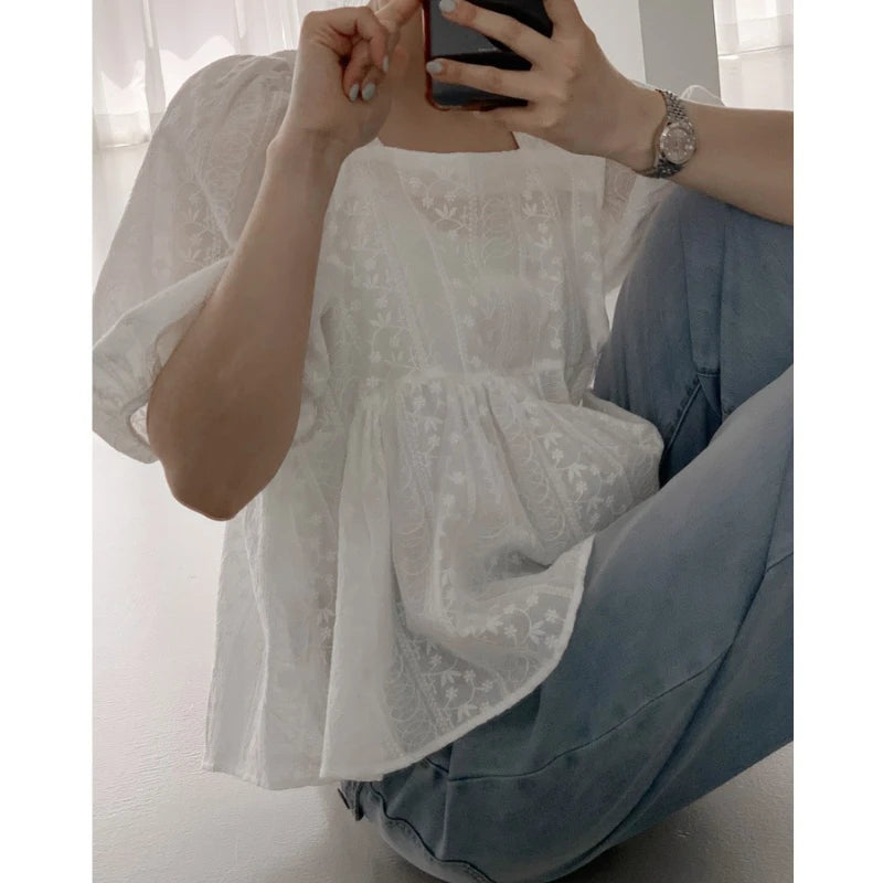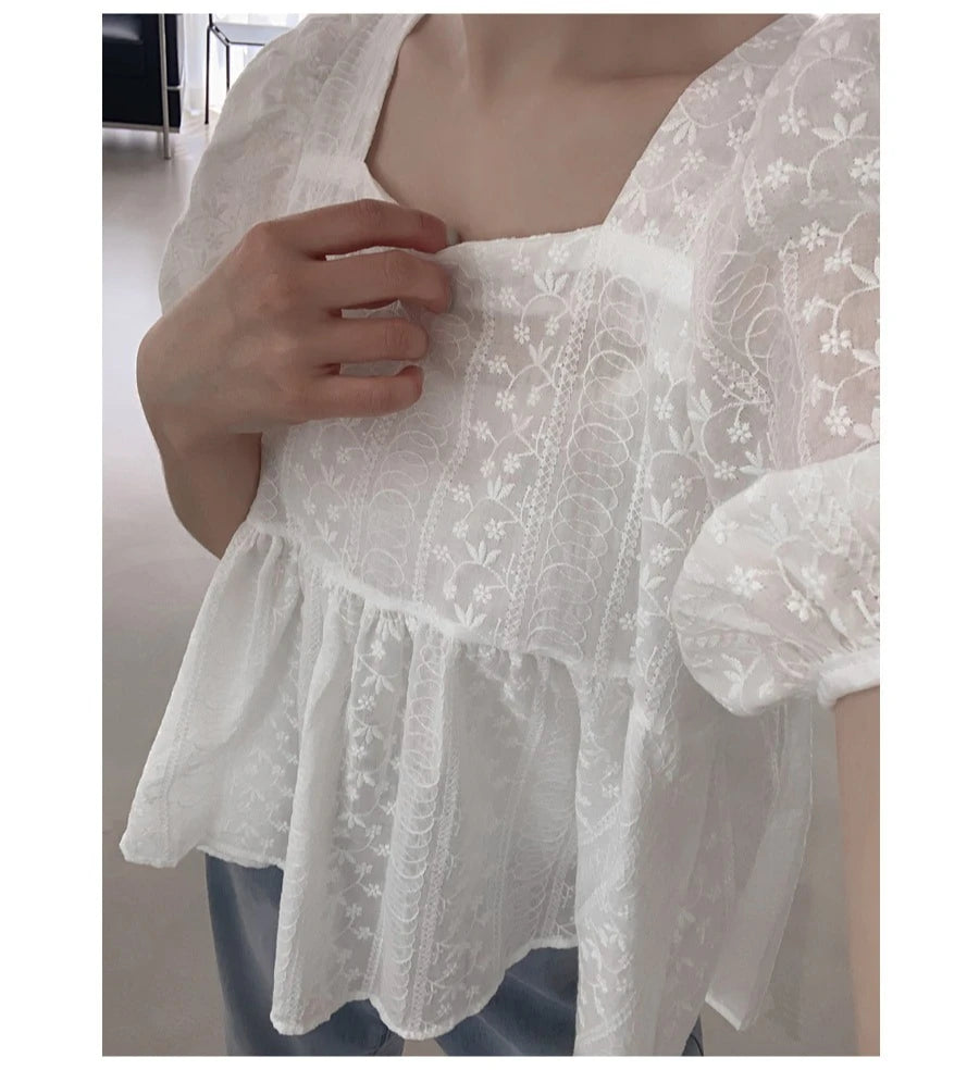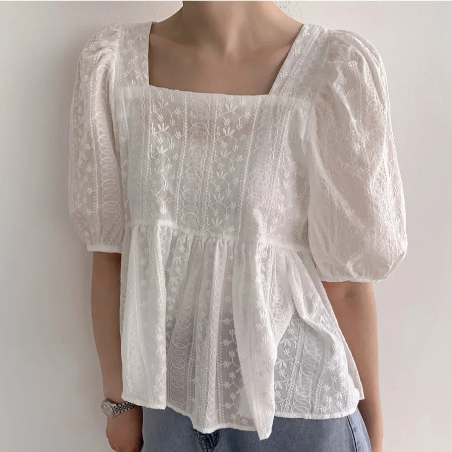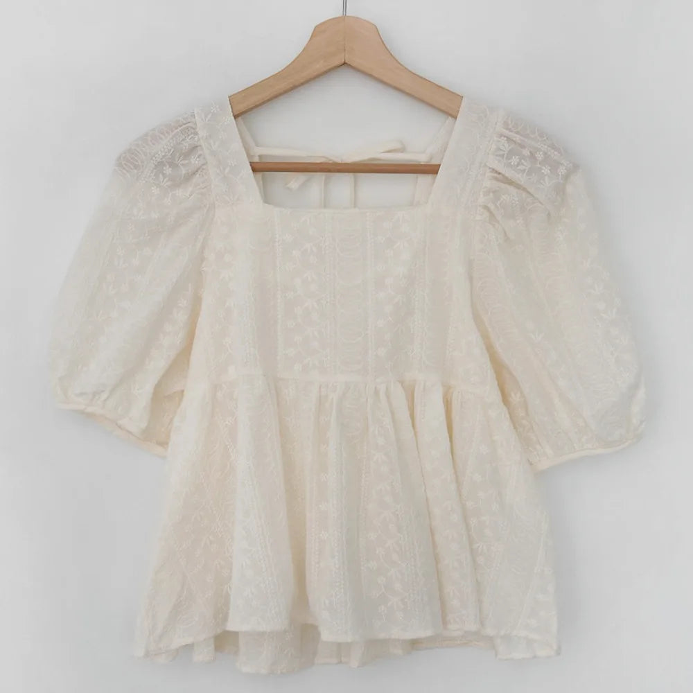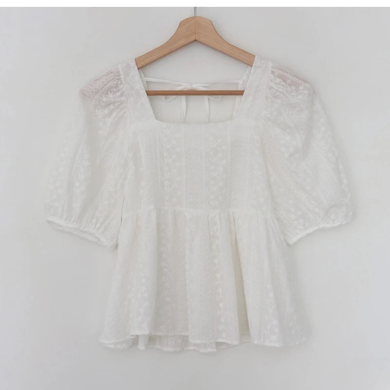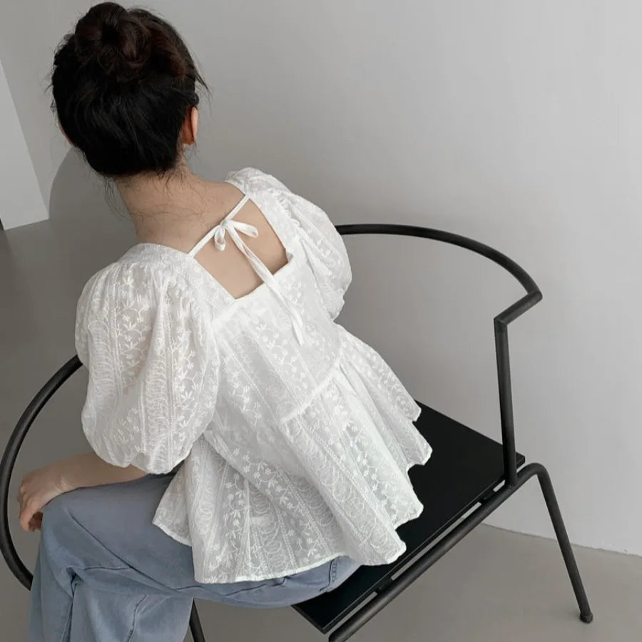 Purpdrank Summer Cotton Puff Sleeve Women's T-shirts 2025 New Square Collar Backless Hollow Out Casual Loose Shirts Tops Female