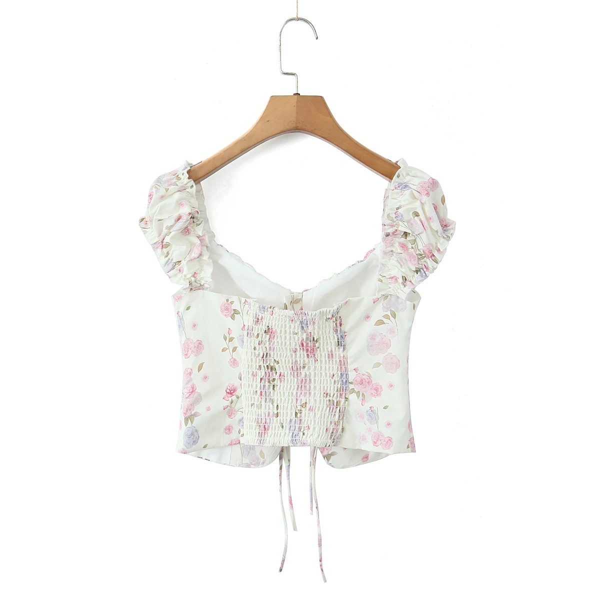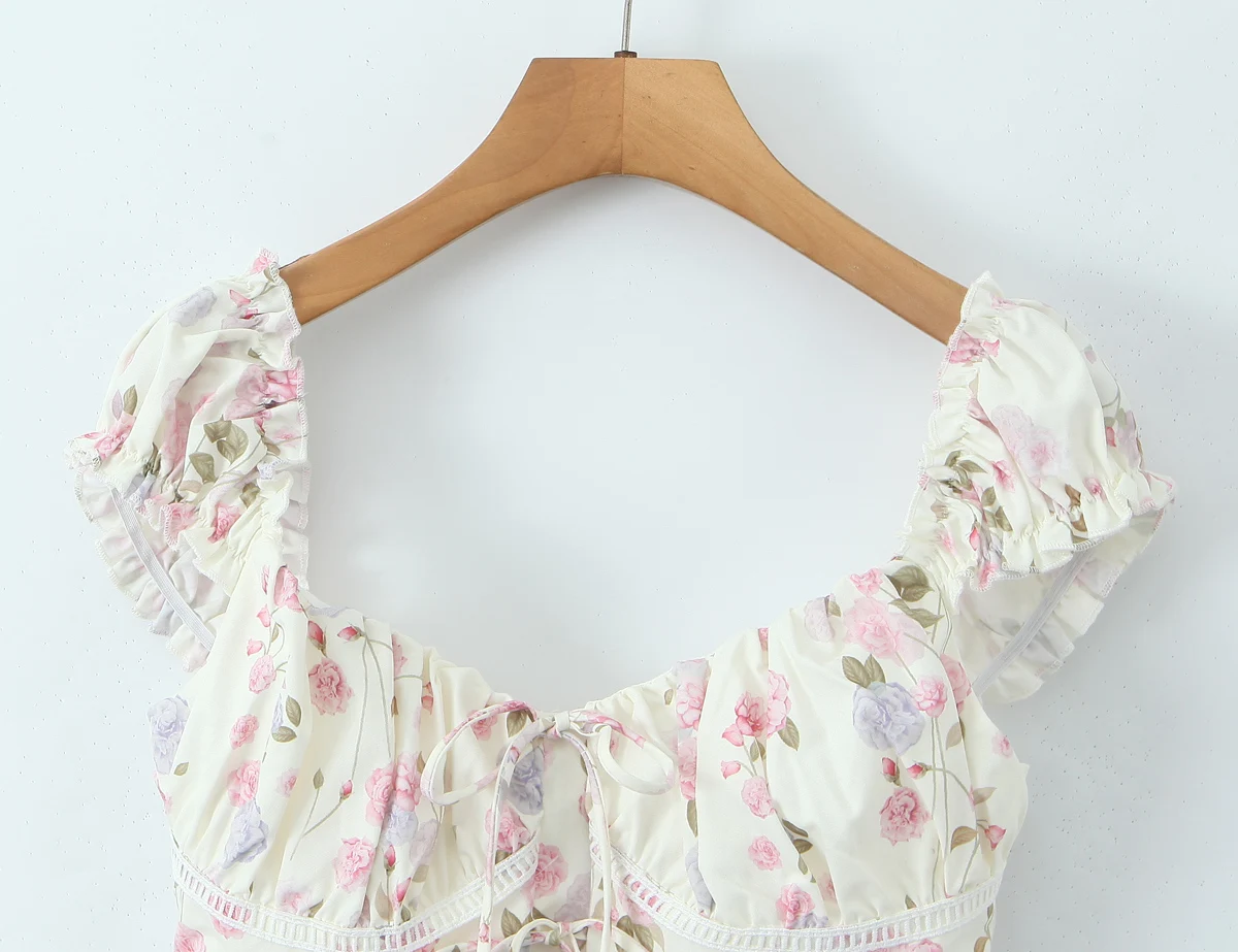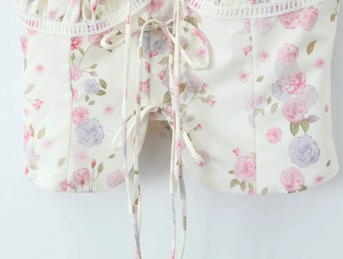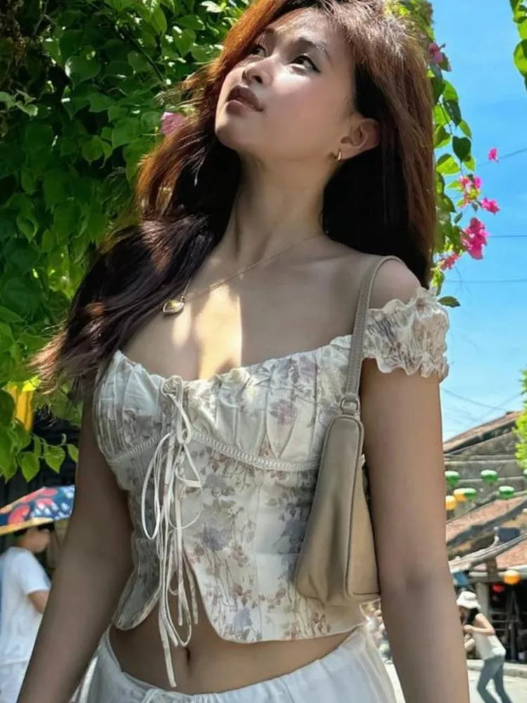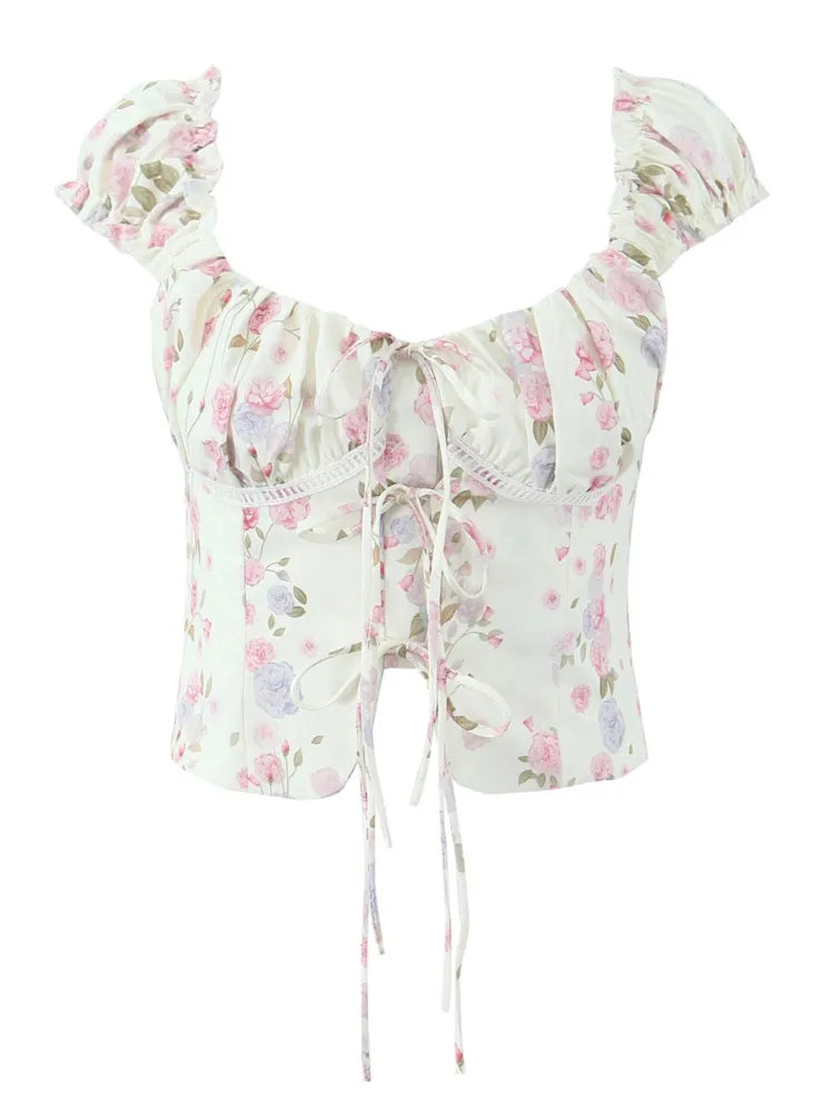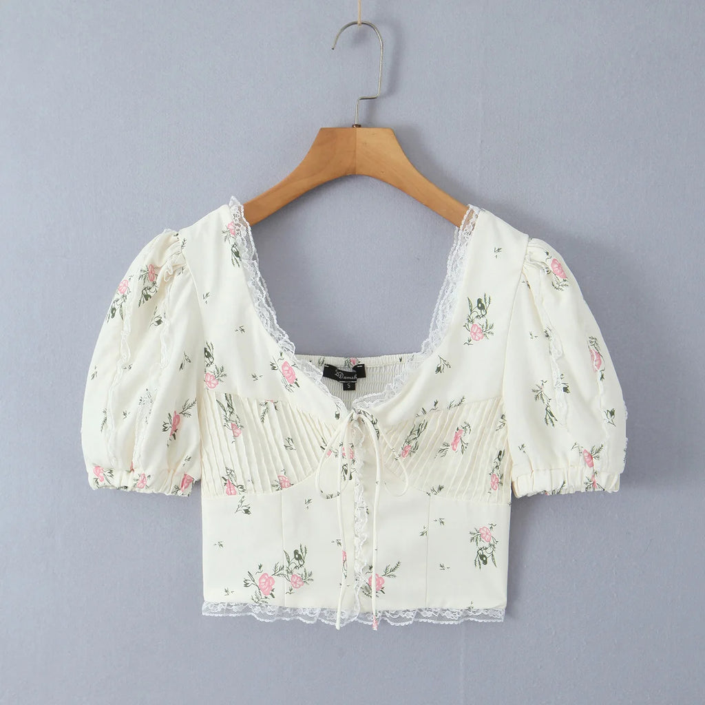 Purpdrank Summer Puff Sleeve French Floral Printed Shirts Elastic Back Sexy Crop Tops Slim Short Top