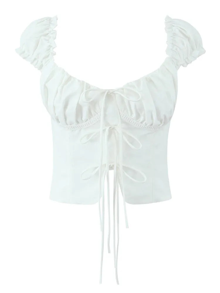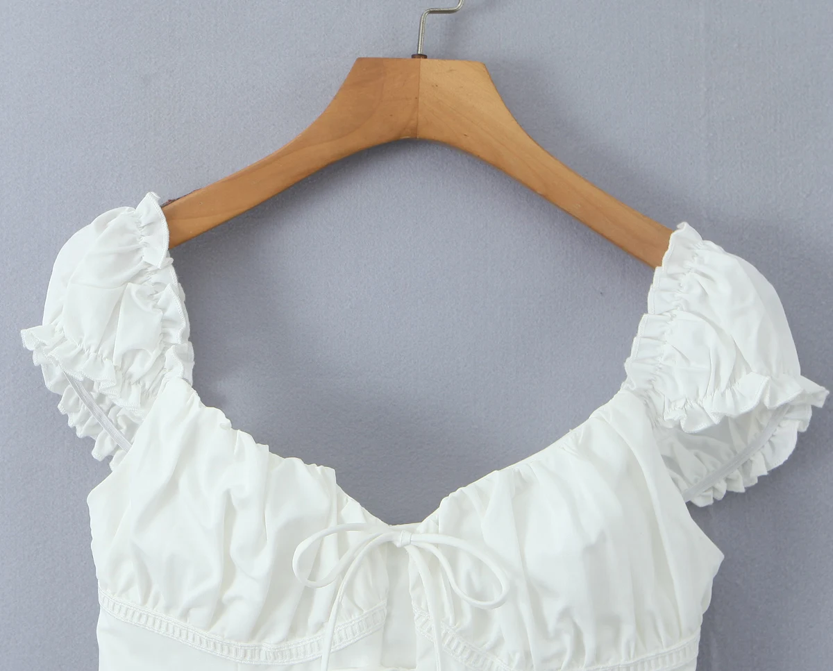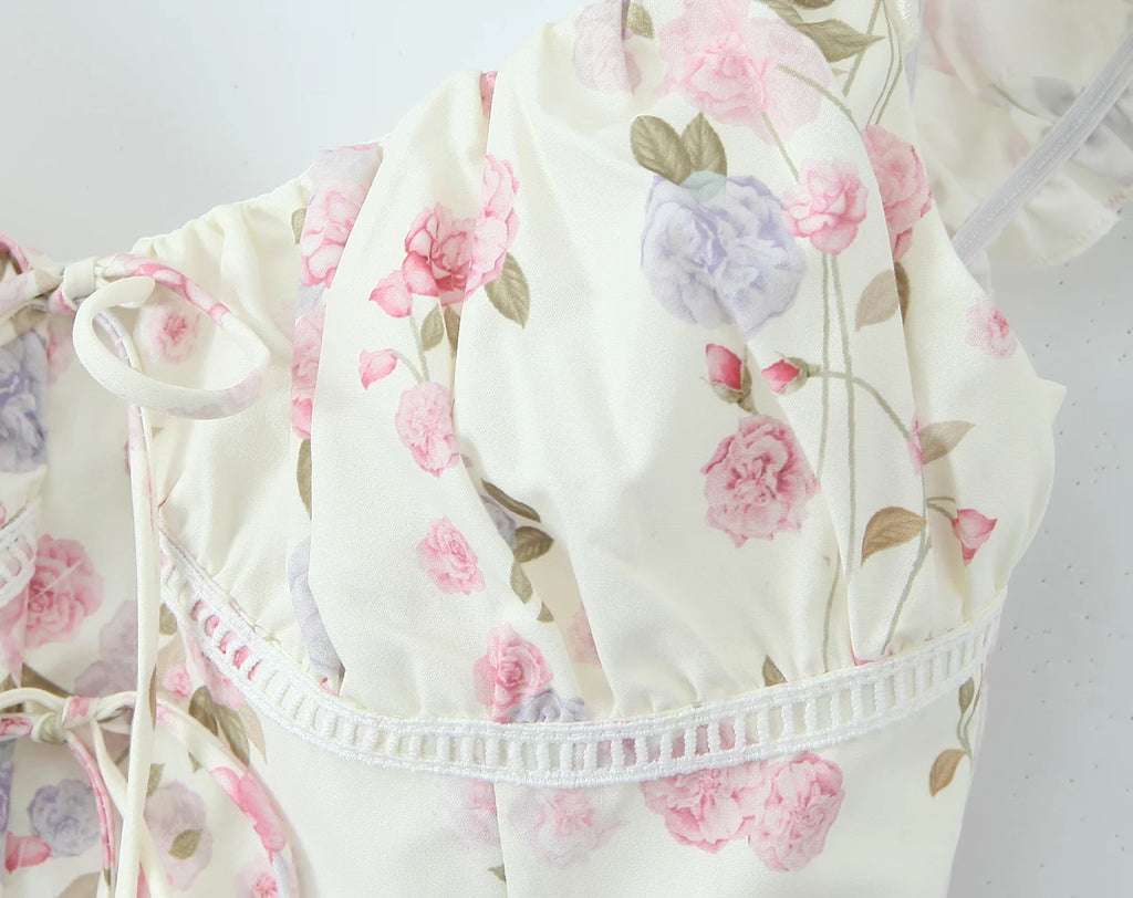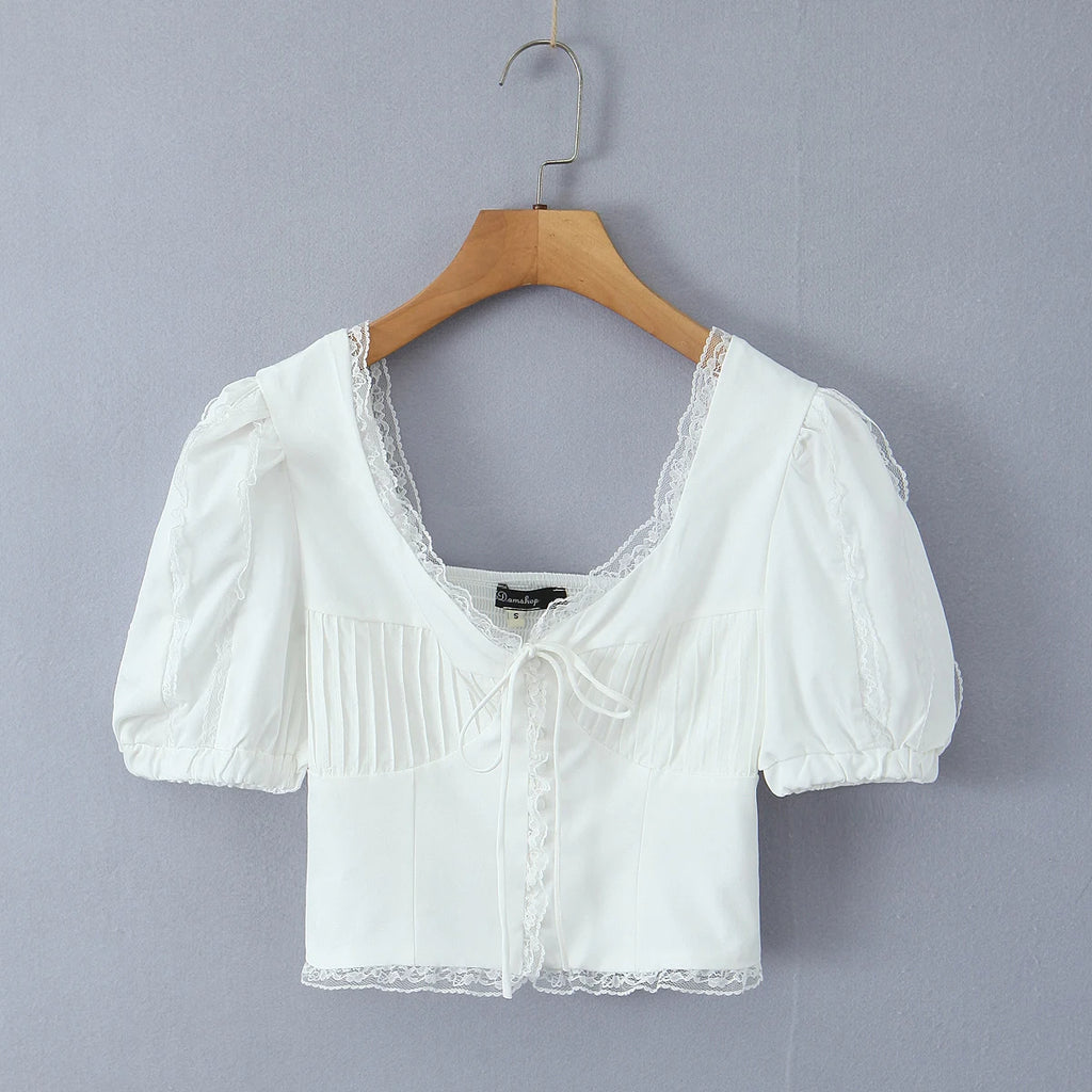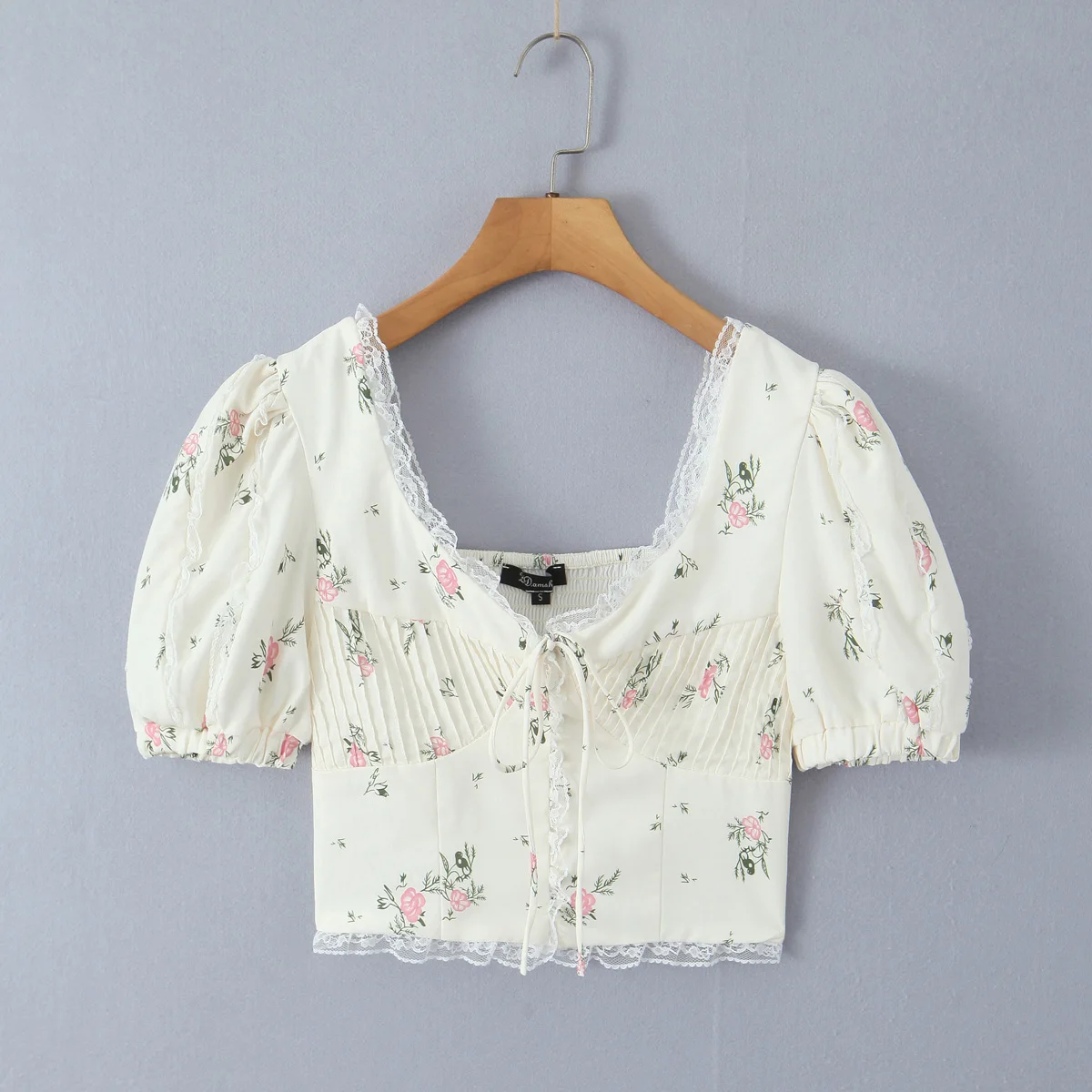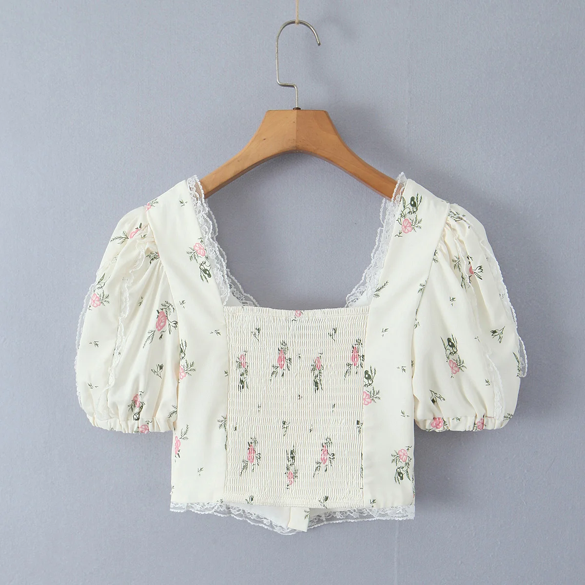 Purpdrank Summer Puff Sleeve French Floral Printed Shirts Elastic Back Sexy Crop Tops Slim Short Top