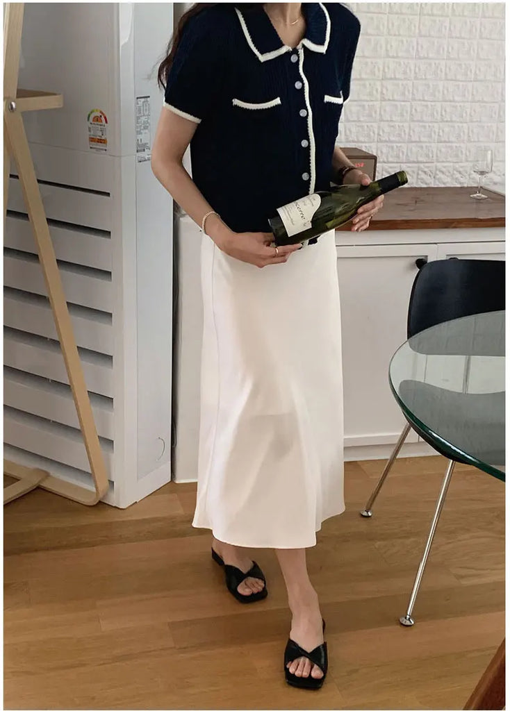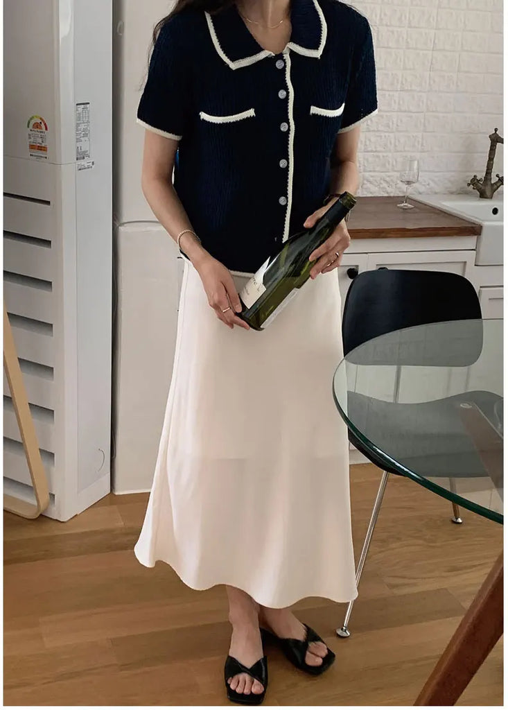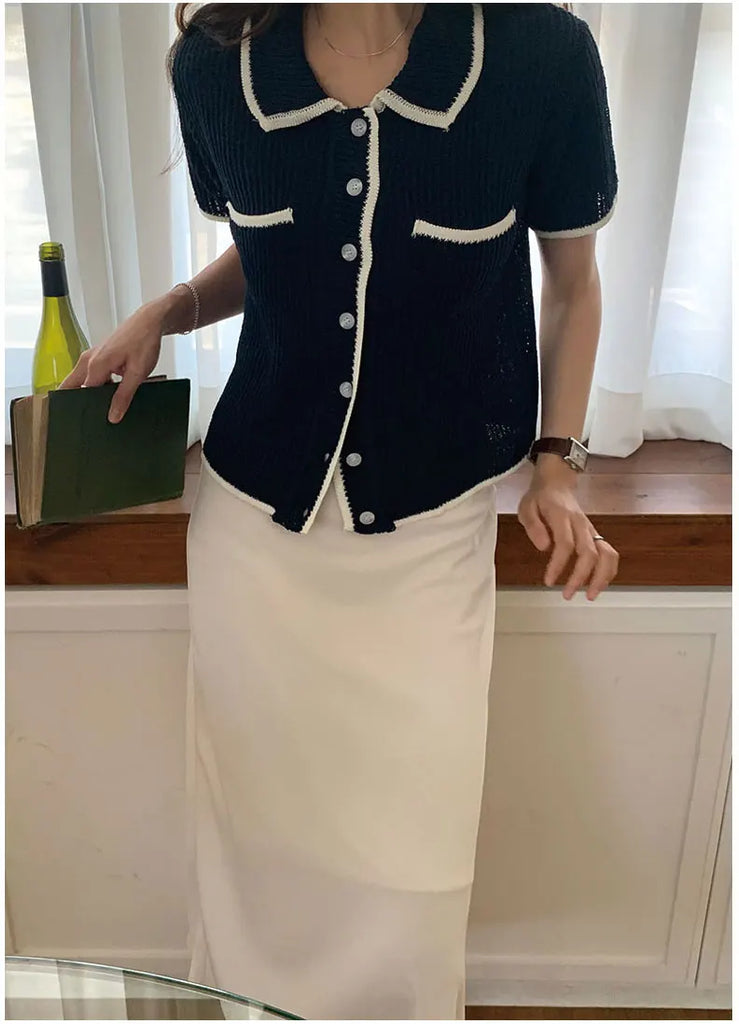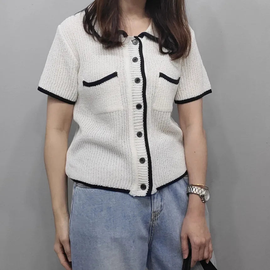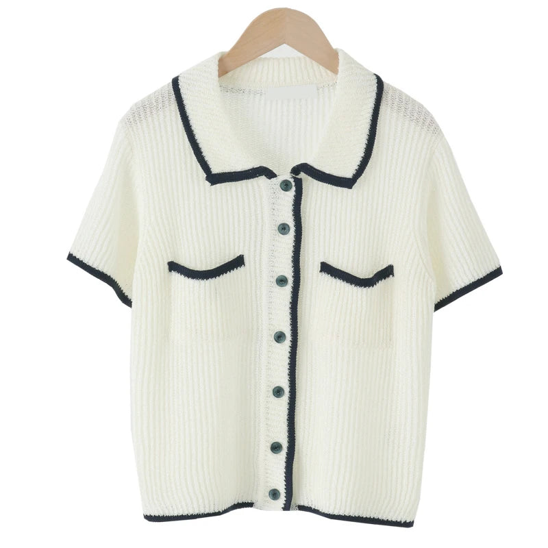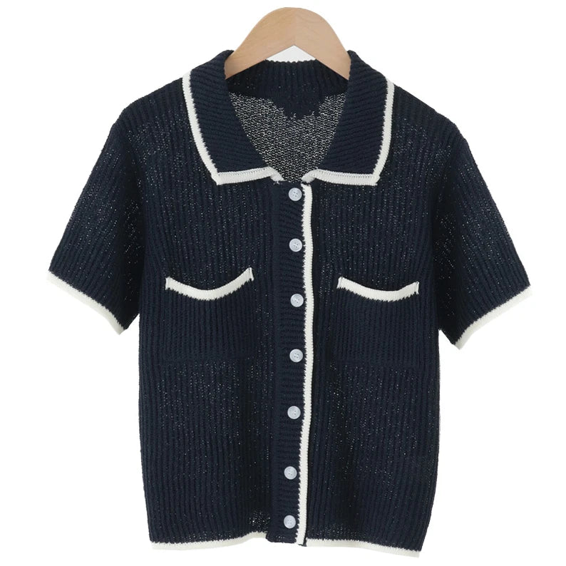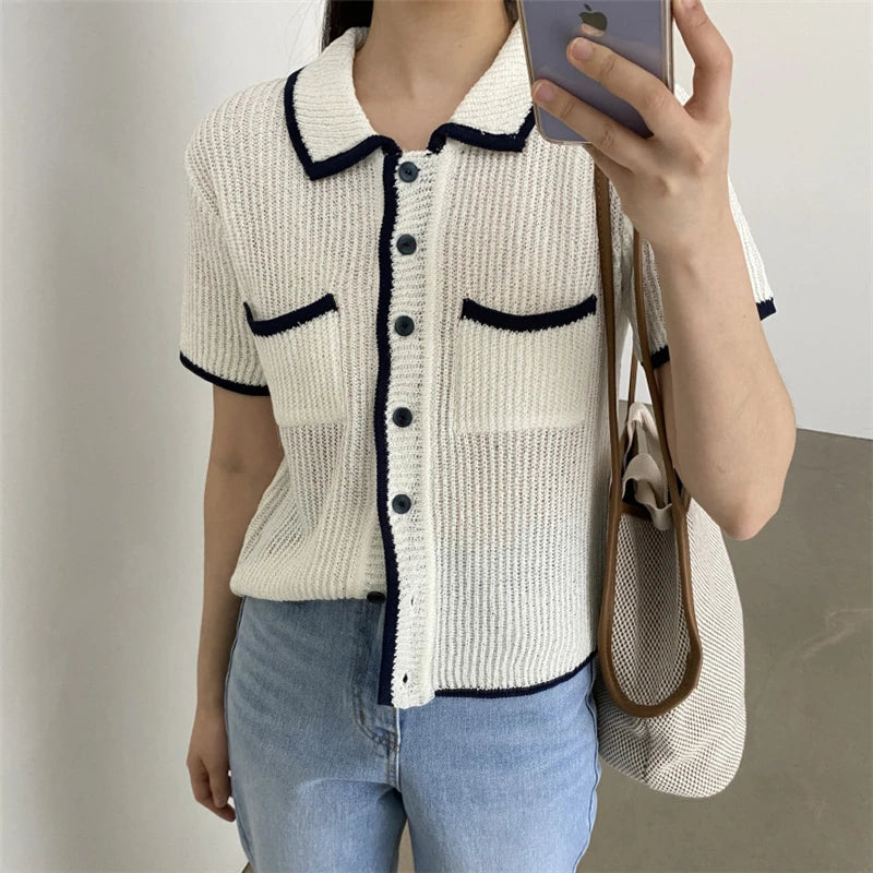 Purpdrank Summer Single Breasted Hollow Out Women's Shirts Pockets Polo Collar Korean Short Sleeve Knitted Tops Female