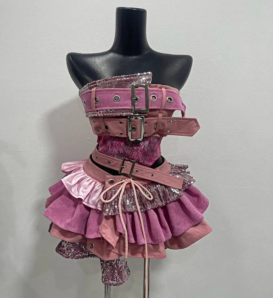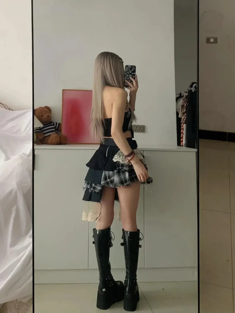 Purpdrank Summer Spicy Girl Vintage 2 Piece Sets Y2k Lace Splice Sleeveless Tops + Irregular Mini Skirt Female Punk Style Design Outfits
