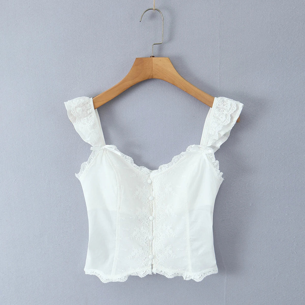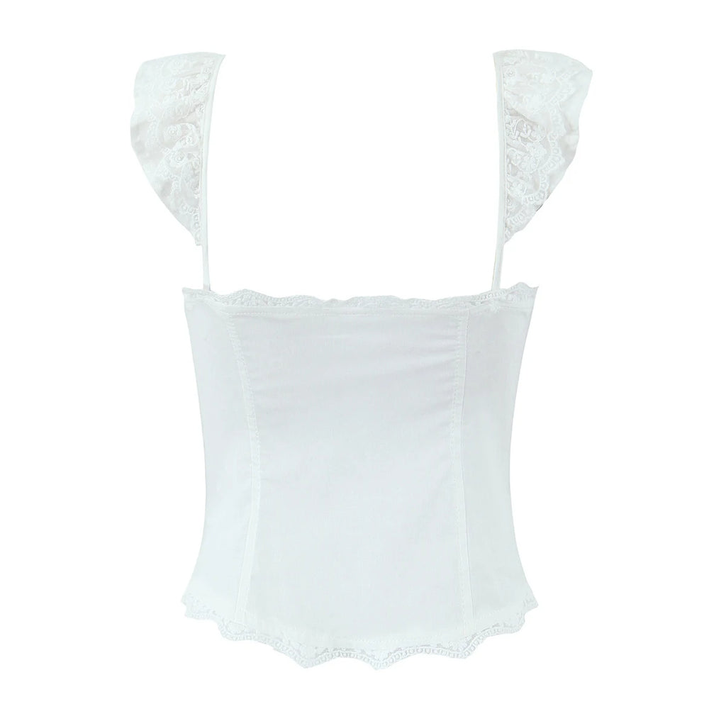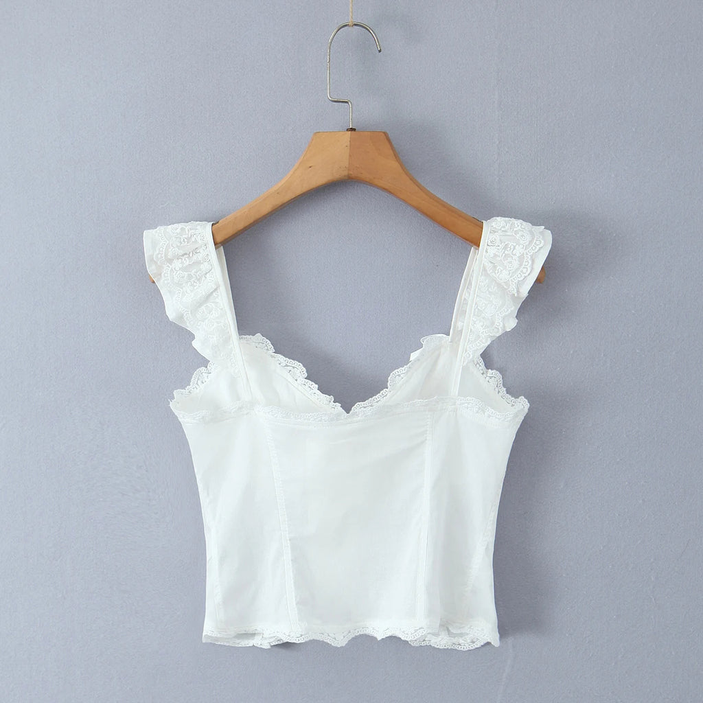 Purpdrank White Spliced Mesh Lace Sexy Corset Women Summer Tank Tops Wood ears V neck Front Buttons Slim Through Buttons Crop Top