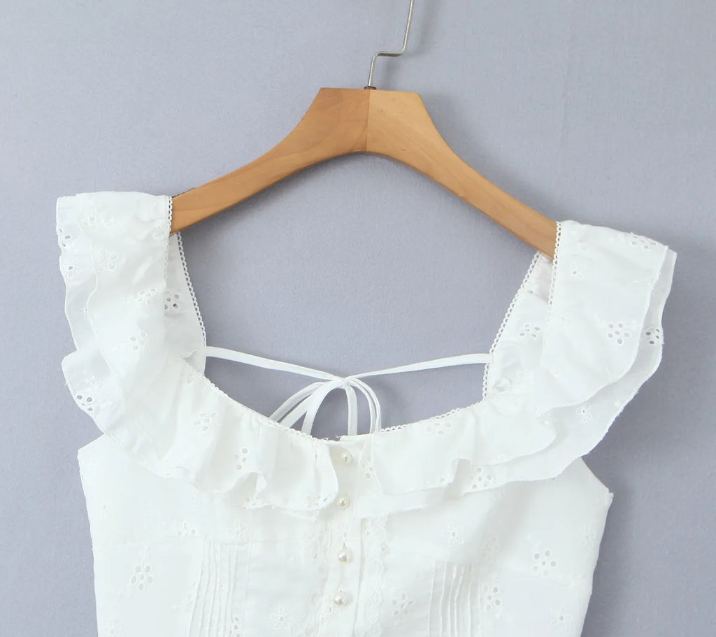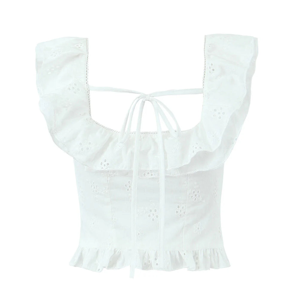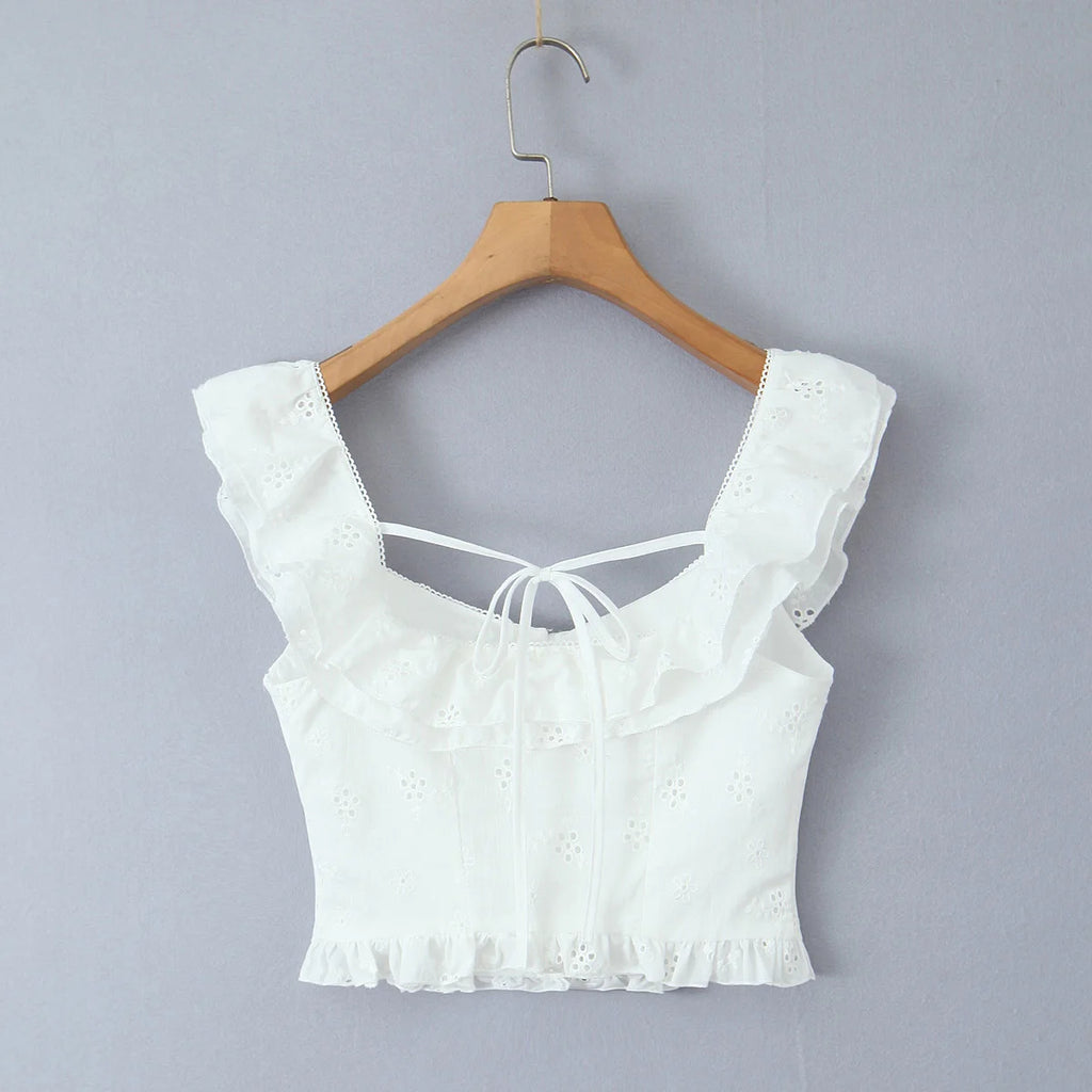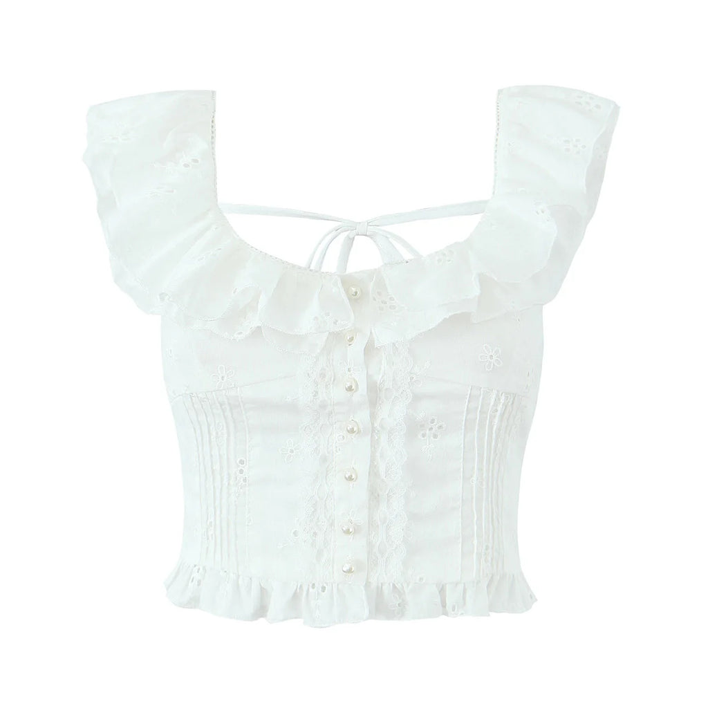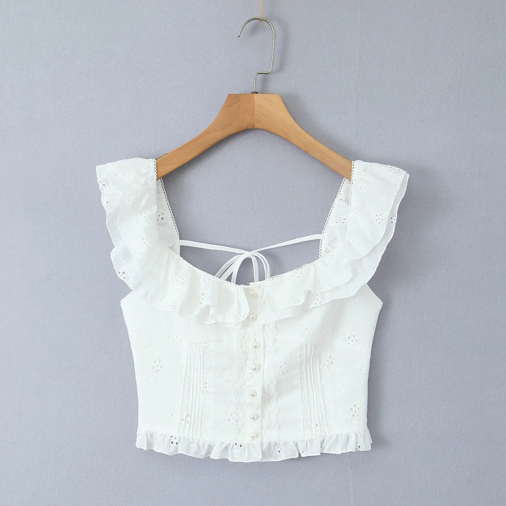 Purpdrank  White Spliced Wood ears Ruffles Embroidery Hollow Out Hole Sexy Corset Women Summer Tank Tops Slim Through Buttons Crop Top