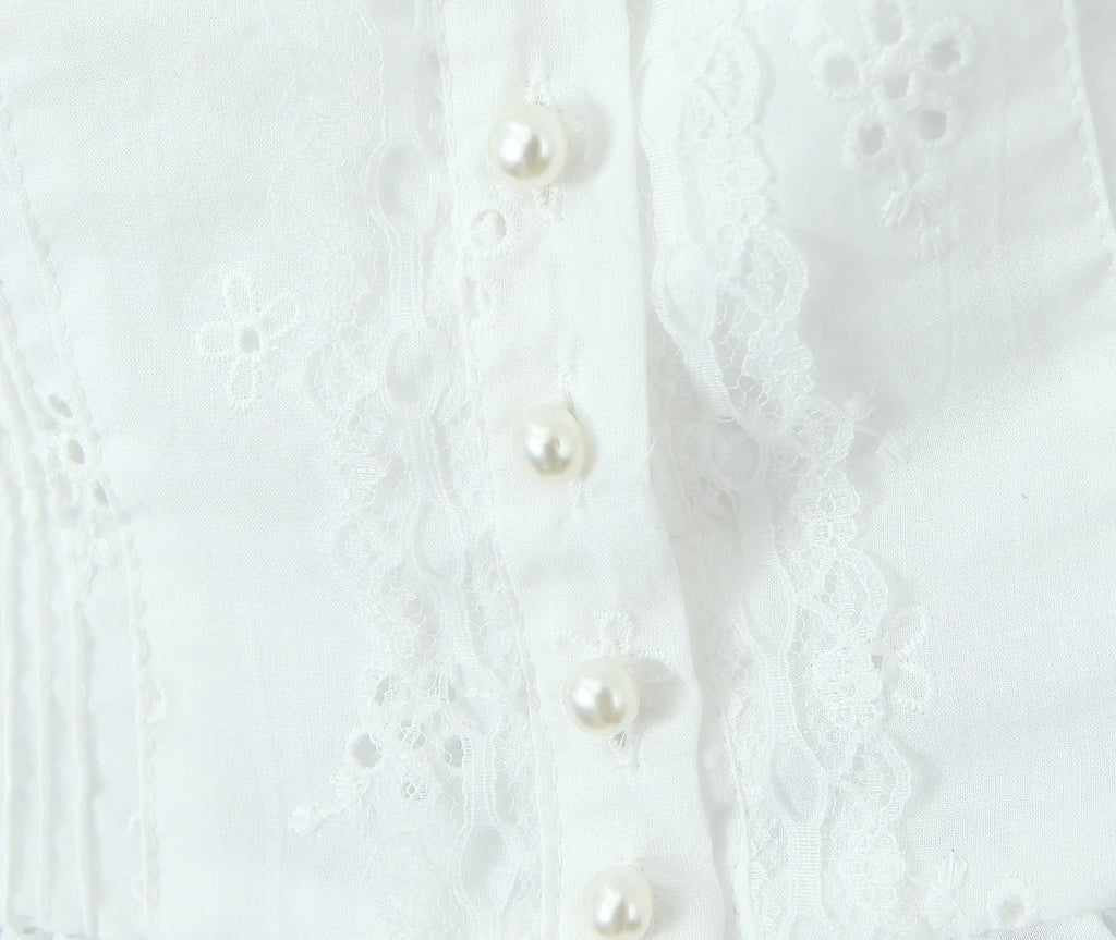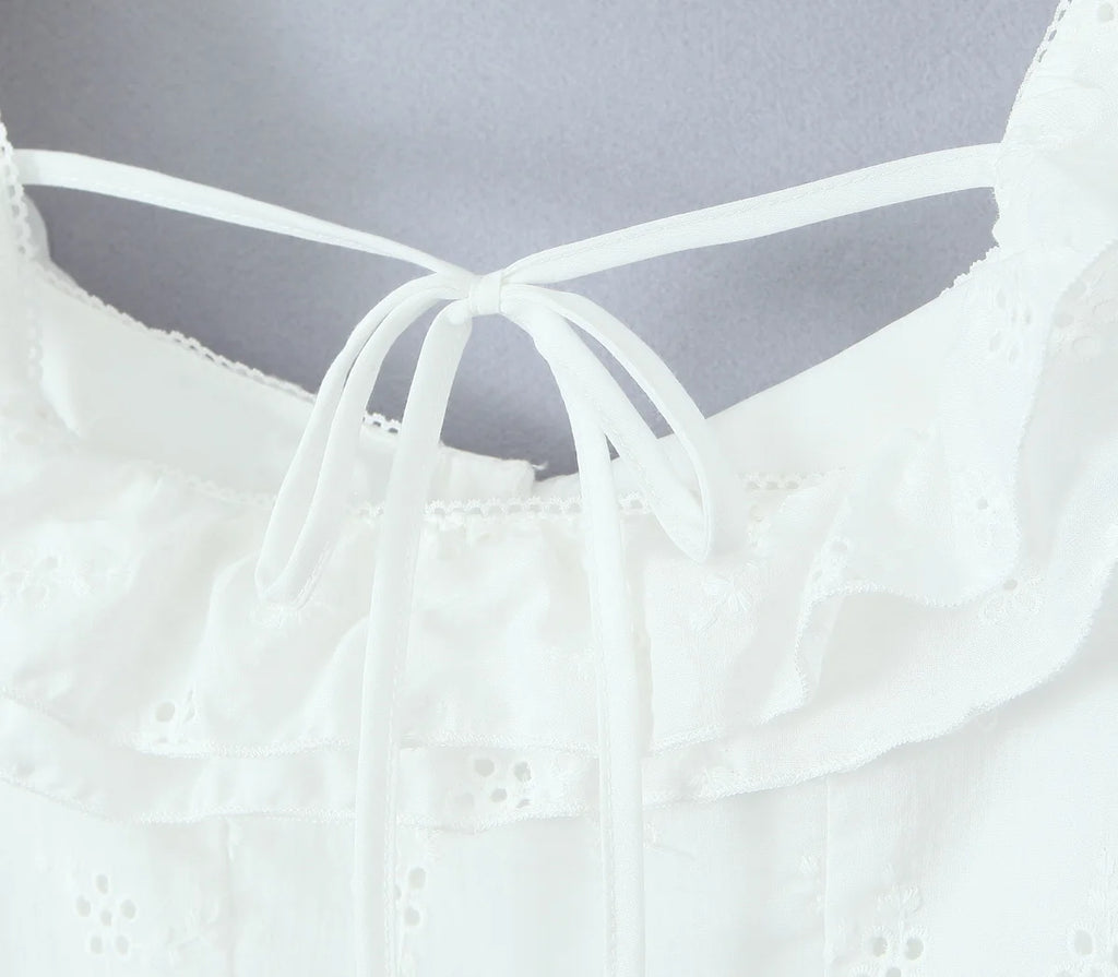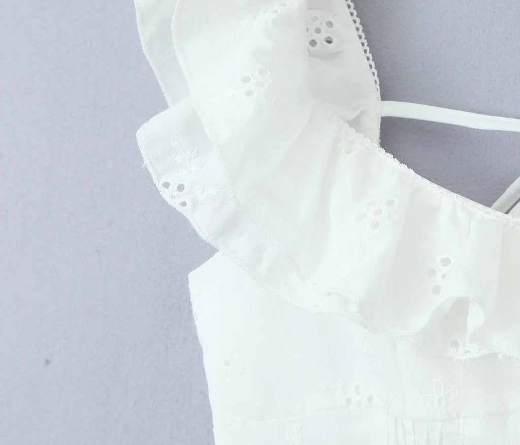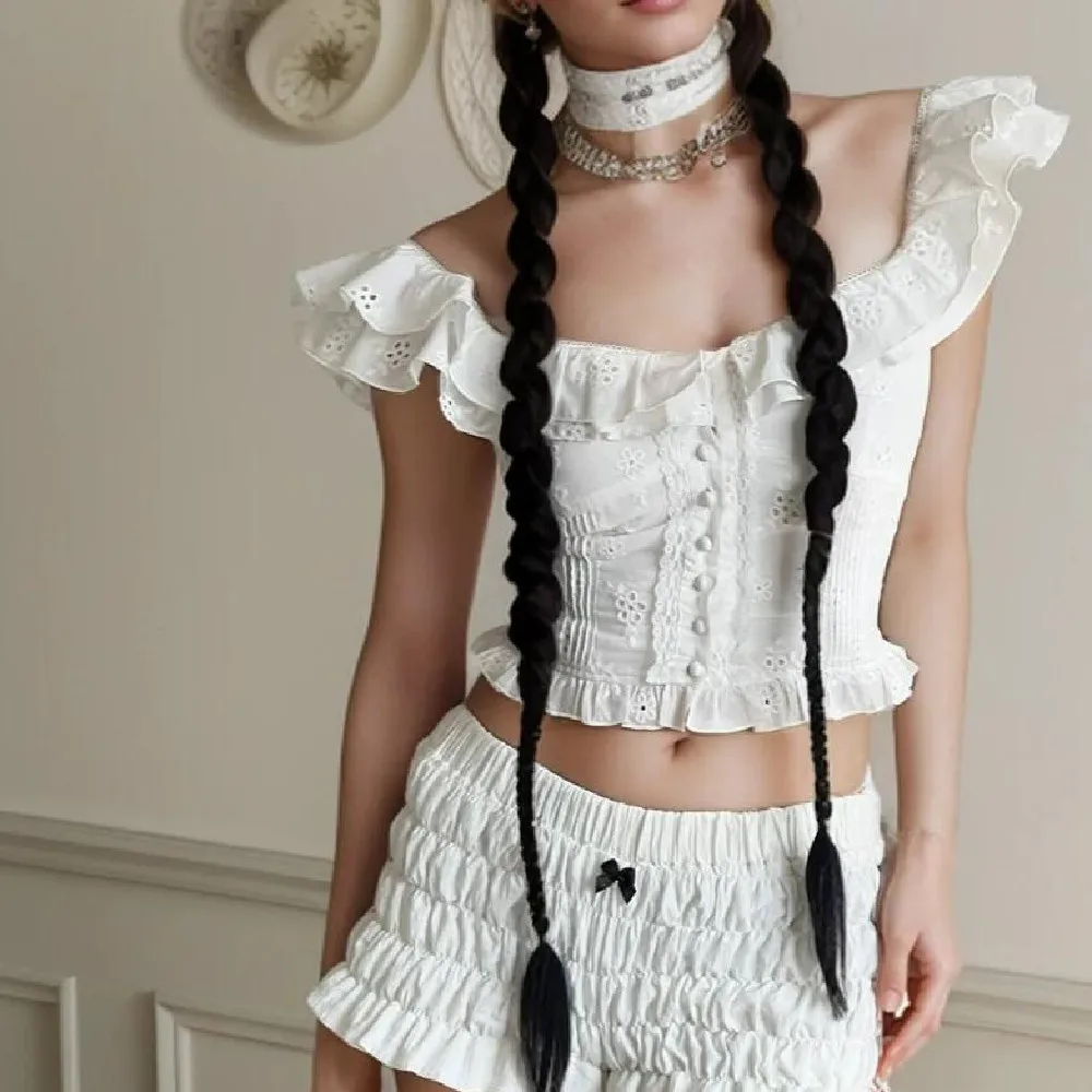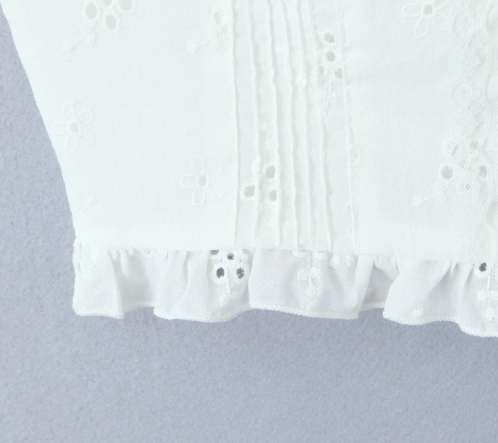 Purpdrank  White Spliced Wood ears Ruffles Embroidery Hollow Out Hole Sexy Corset Women Summer Tank Tops Slim Through Buttons Crop Top