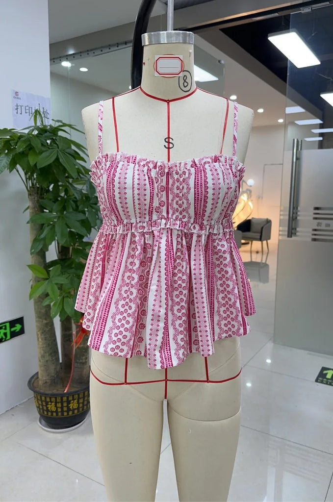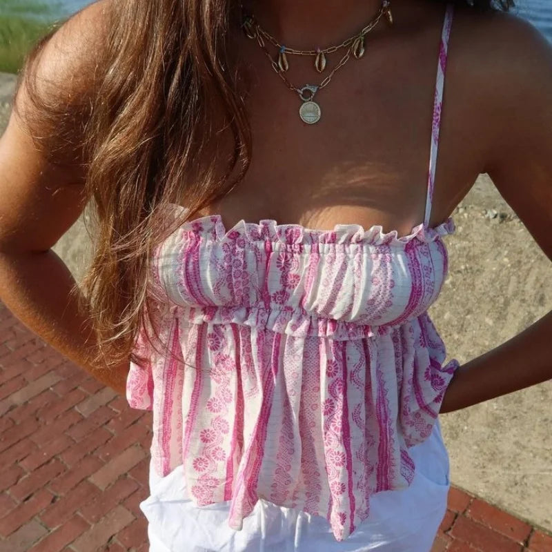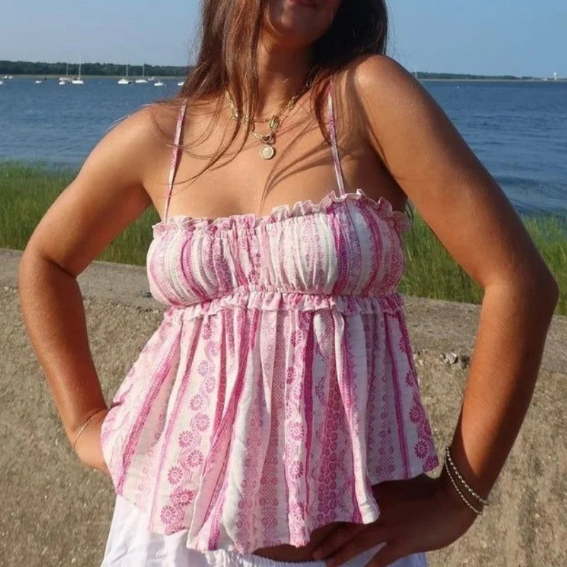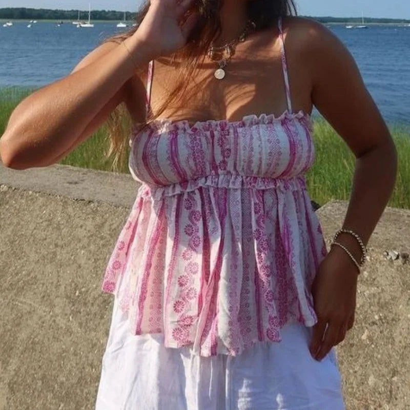 Purpdrank Women Summer Spaghetti Strap Babydoll Cami Tops Sweet Floral Print Frill Trim Backless Camisole Vest Streetwear