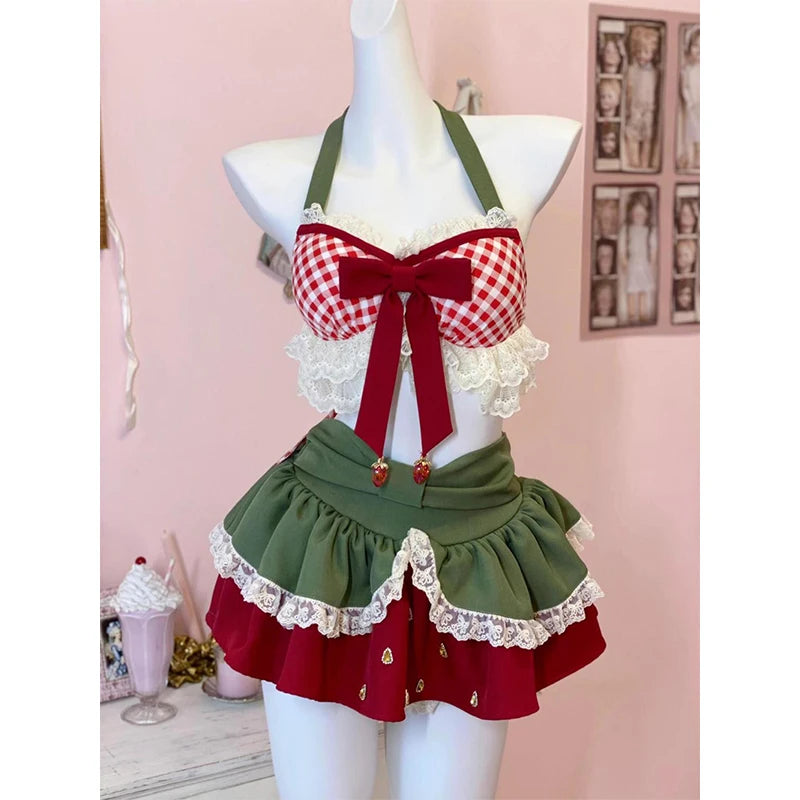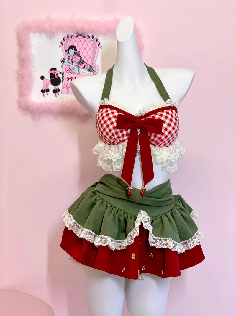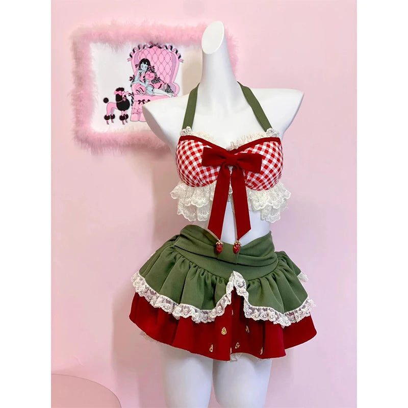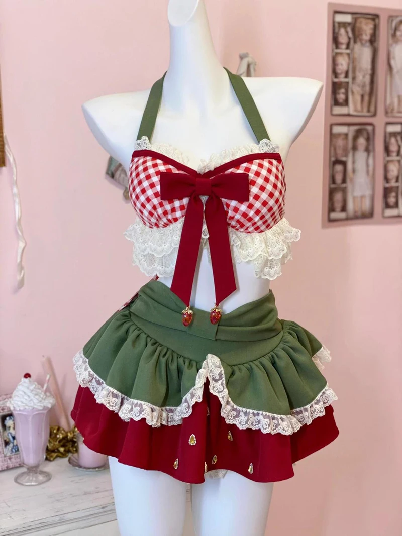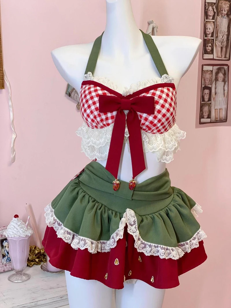 Purpdrank Y2K 2 Pieces Set Woman Outfit Kawaii Bow Plaid Lace Halter Tops Gyaru Ruffles Mini Skirt Summer Japanese Design Clothes