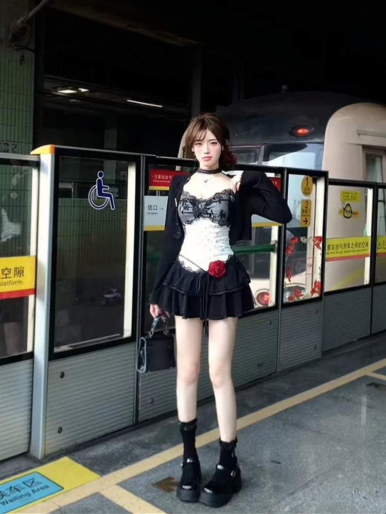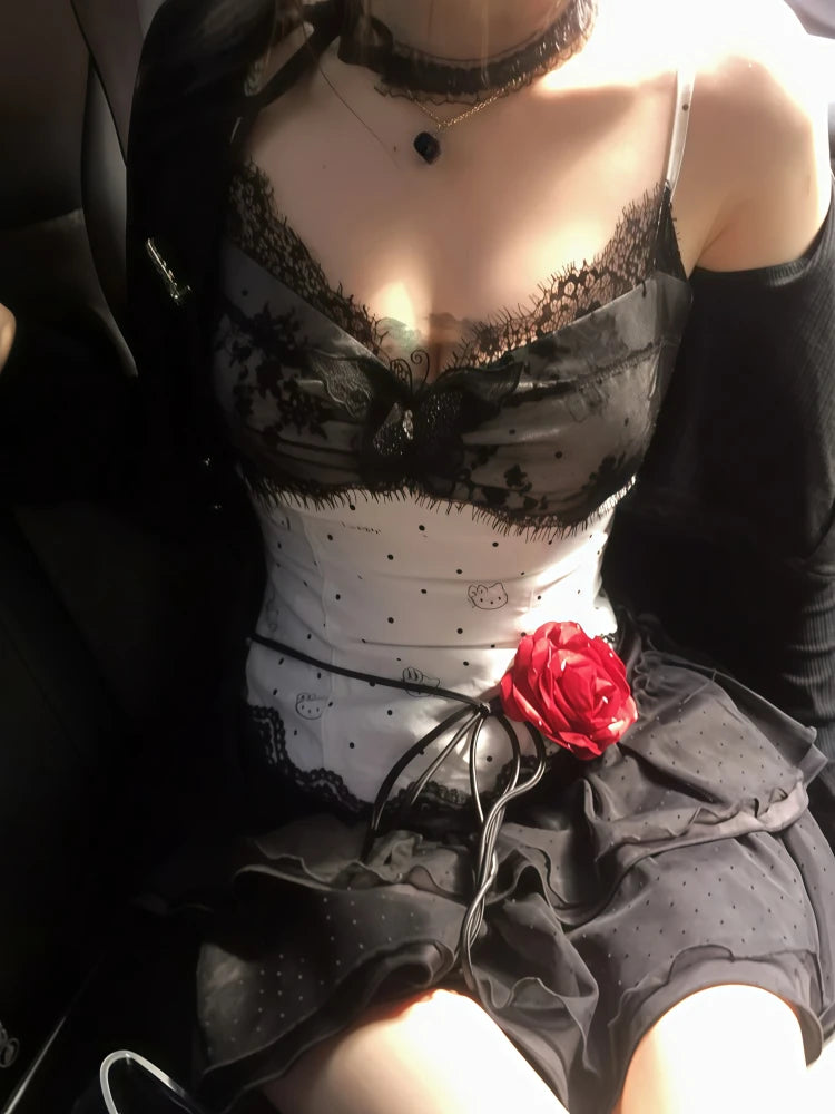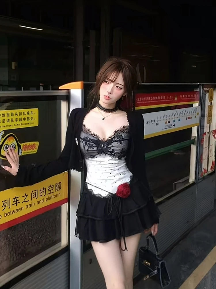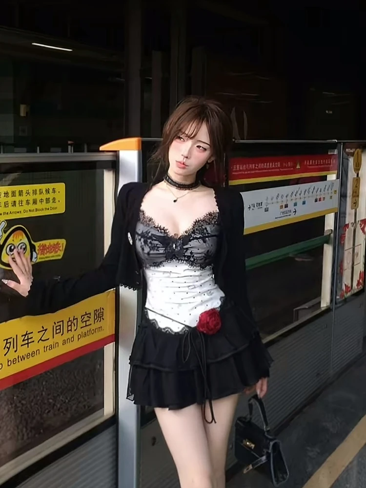 Purpdrank 2000s Aesthetic Lace 2 Piece Set Women Gothic Y2k Slim Sling + Mini Skirt Retro Hottie Punk Harajuku Polka Dot Backless Outfits