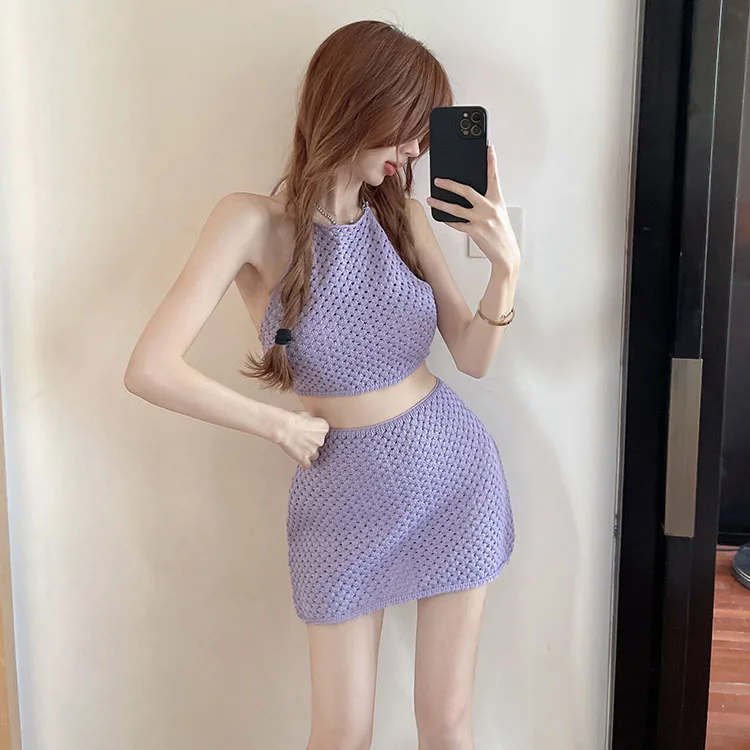 Purpdrank Boho Style Light Purple Crochet Beach Dress Women Summer Sexy Backless Camis & Short Knitted Skirt Suits Seaside 2 Piece Set