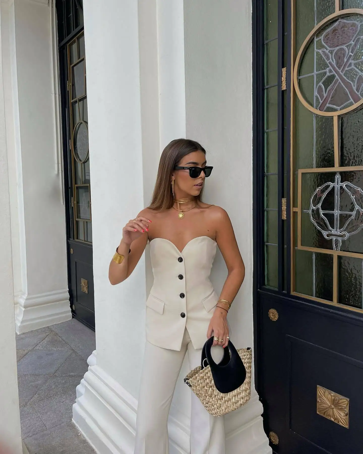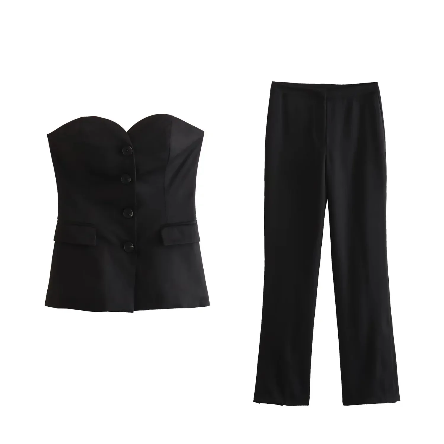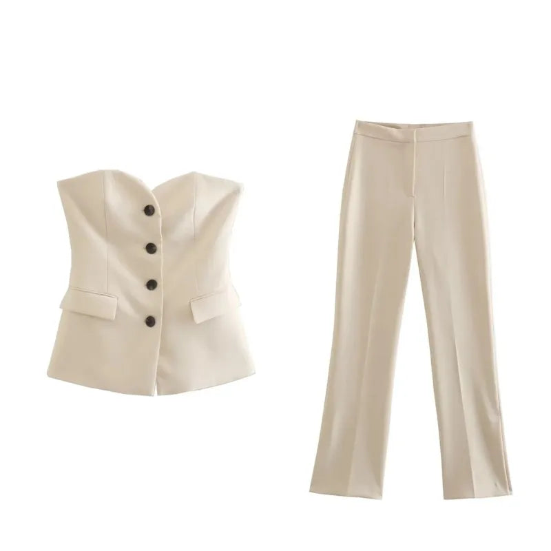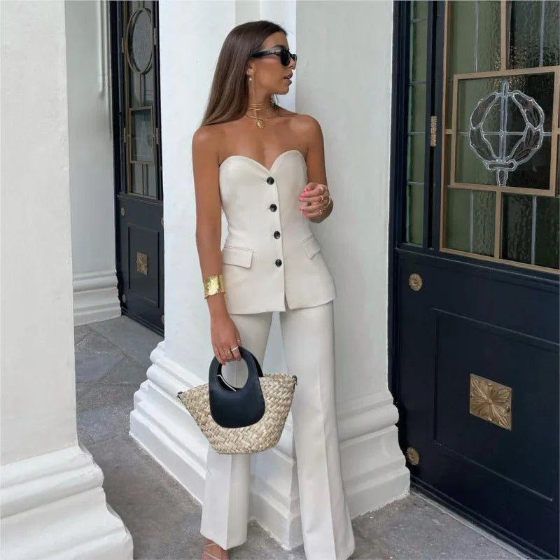 Purpdrank Elegant Solid 2 piece Pant Sets 2025 Button Strapless Sexy Tank Tube Tops + Straight Leg Slit Trouser Female Chic Streetwear