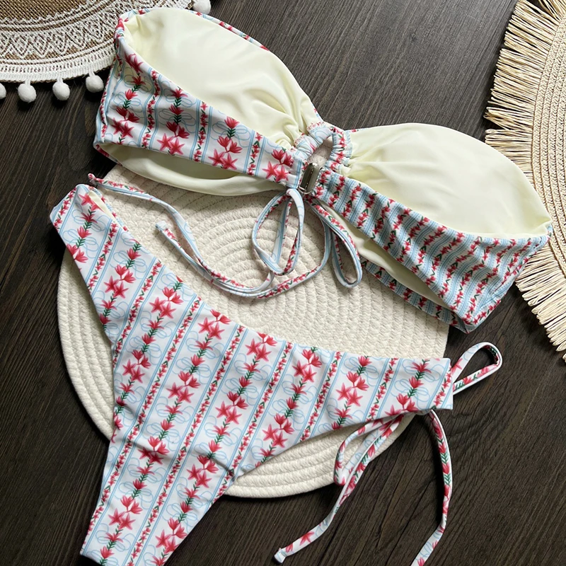 Purpdrank Floral Patchwork Bikini Set Tie Front Up Strapless Bra + Bandage Thong Women 2 Piece Swimsuit Beach Vacation Brazilian Swimwear