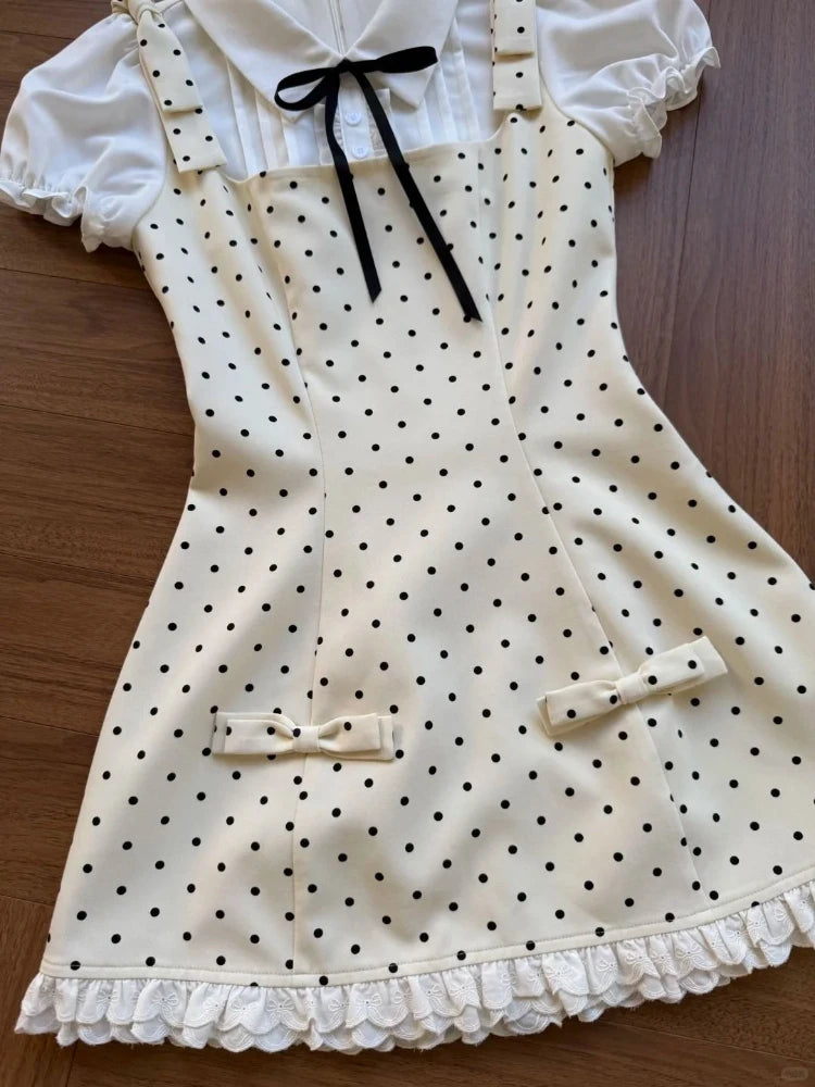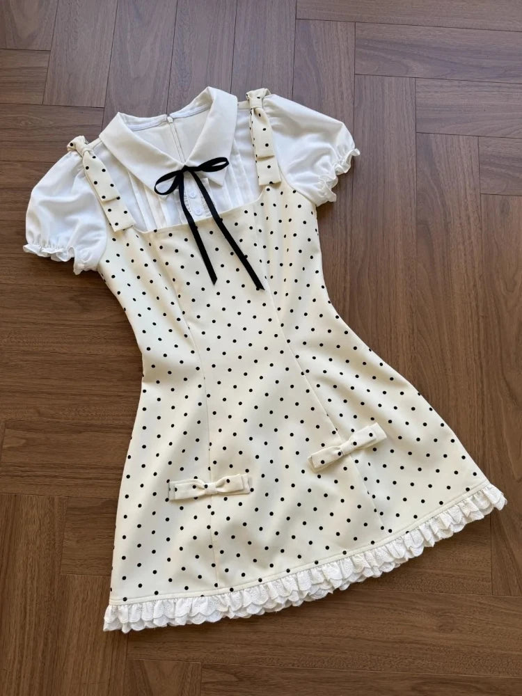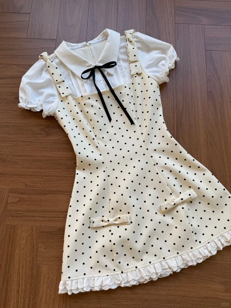 Purpdrank Japanese Style Sweet Polka Dot Women Dress Elegant Fake 2 Piece Set Cute Bow Dress Fashion Princess Chic Korean Popular Clothes