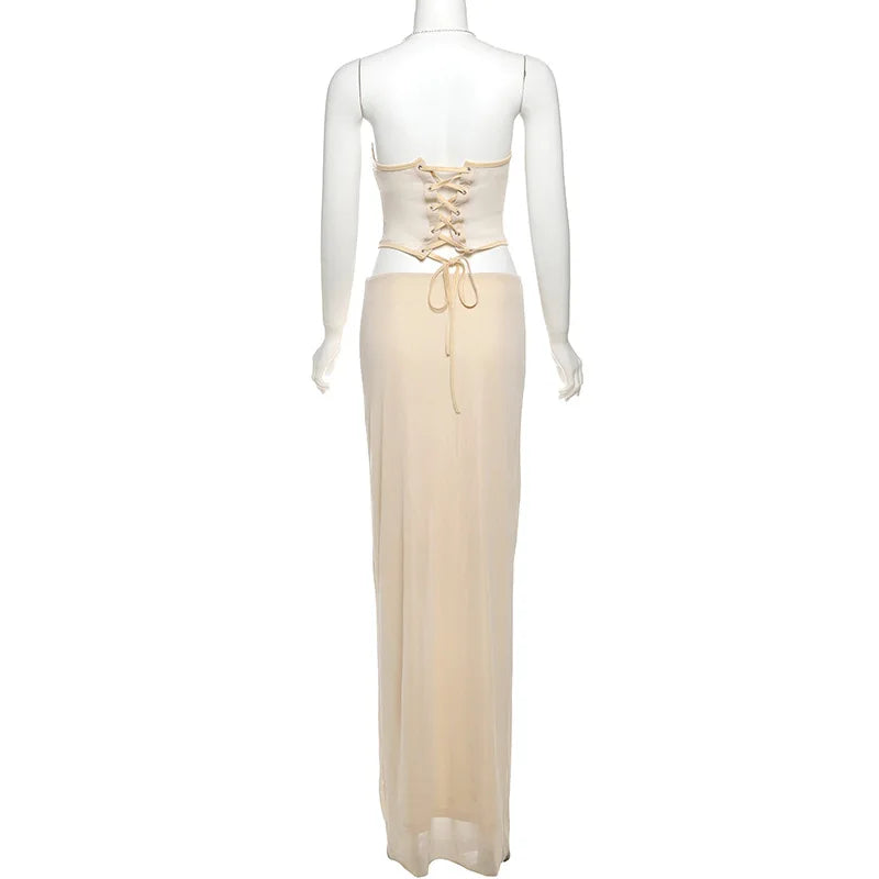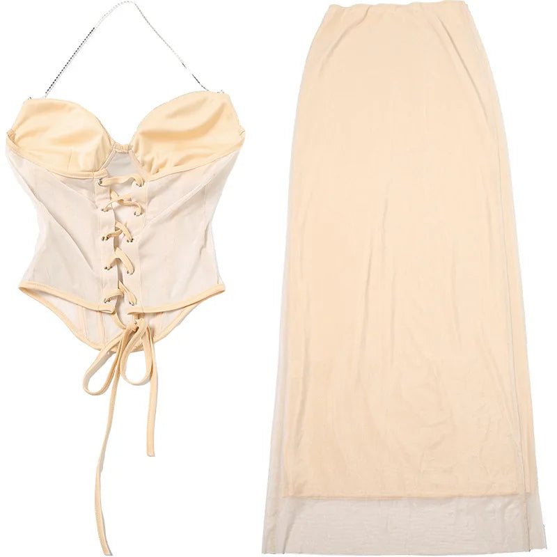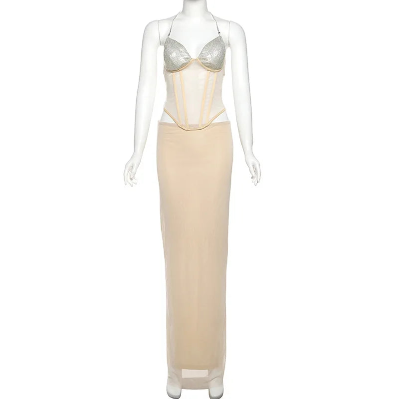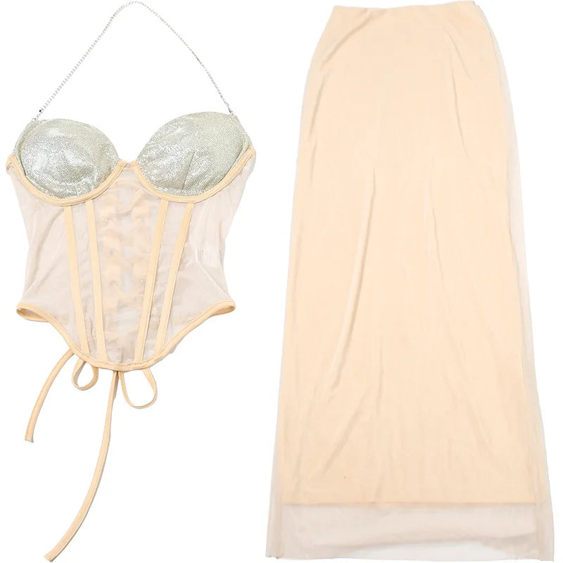Purpdrank Sexy Sheer Mesh Women Two Piece Dress Sets 2025 Summer Fashion Sequined Strapless Bandage Tube Top and Long Skirts Matching Set