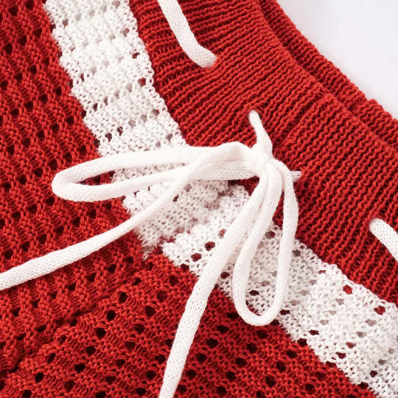 Purpdrank Striped Sexy Drawstring Knitted Women Two Piece Sweater Short Set 2025 Summer Fashion Hollow Out Tube Top and Mini Shorts Outfit