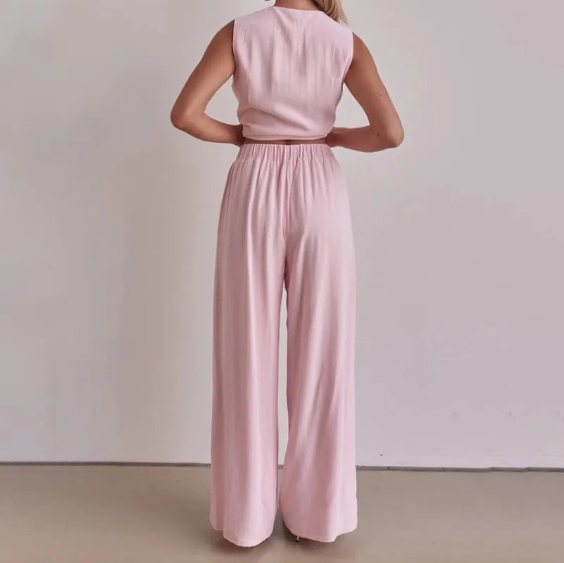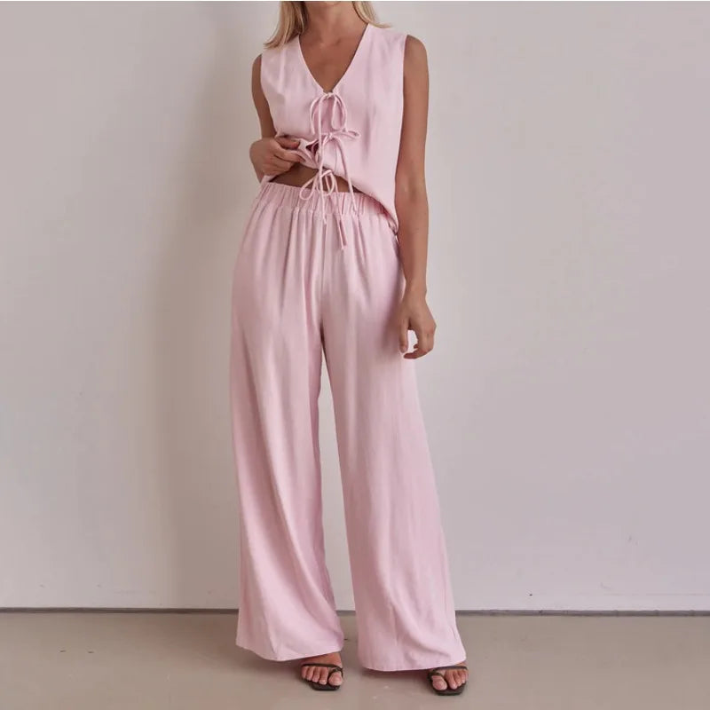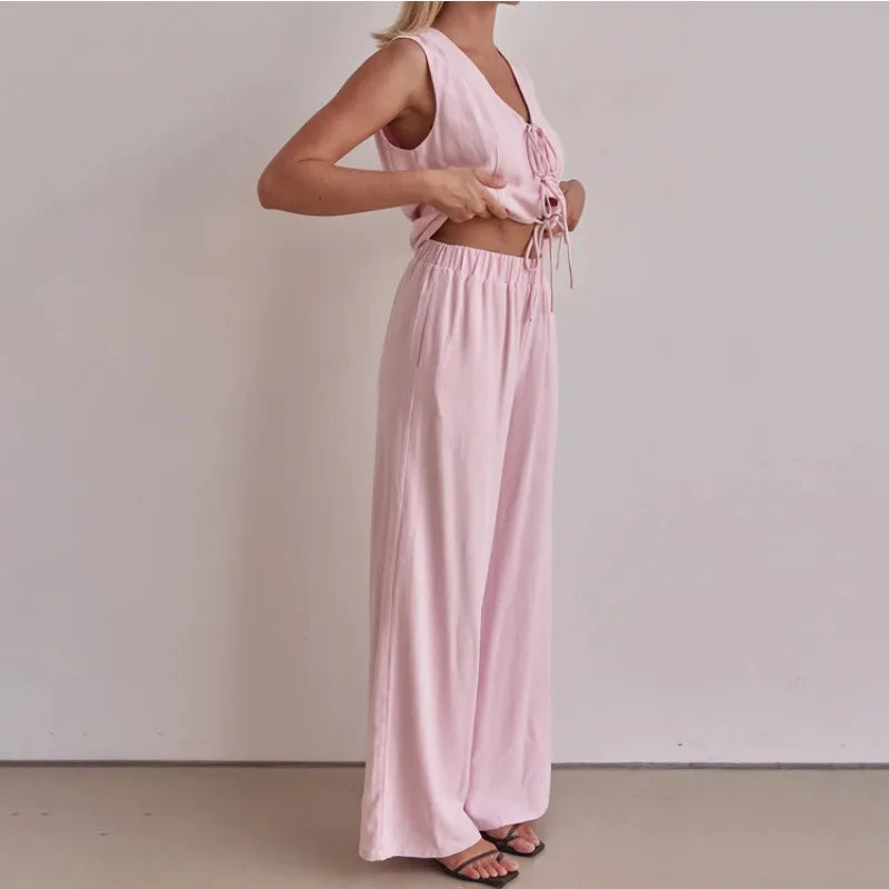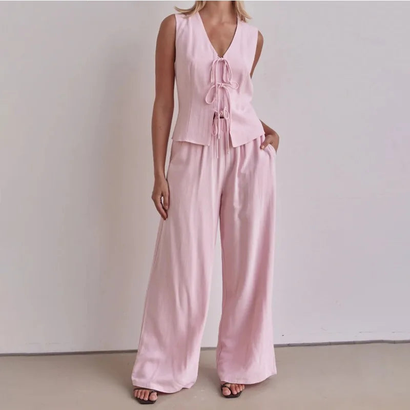 Purpdrank  Trousers Suit Office Lady Outfits Elegant Women Loose Two Piece Set Sleeveless Lace Up Vest Top Elastic Waist Wide Leg Pants Set