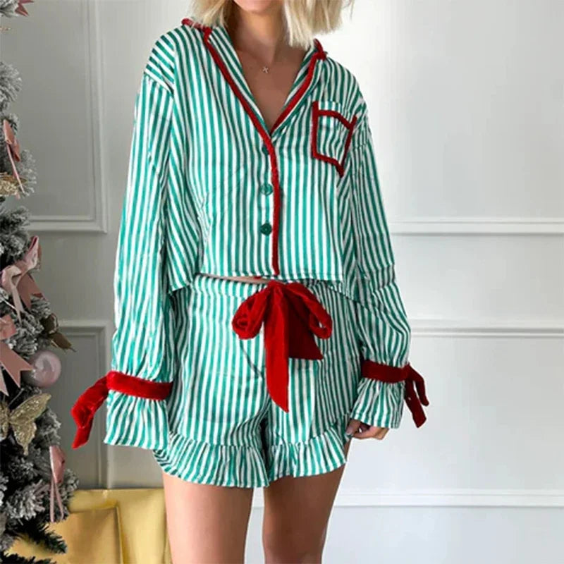 Purpdrank  Women Christmas 2 Piece Pajama Set Bowknot Striped Print Long Sleeve Button Down Shirt Tops Elastic Shorts Holiday Sleepwear