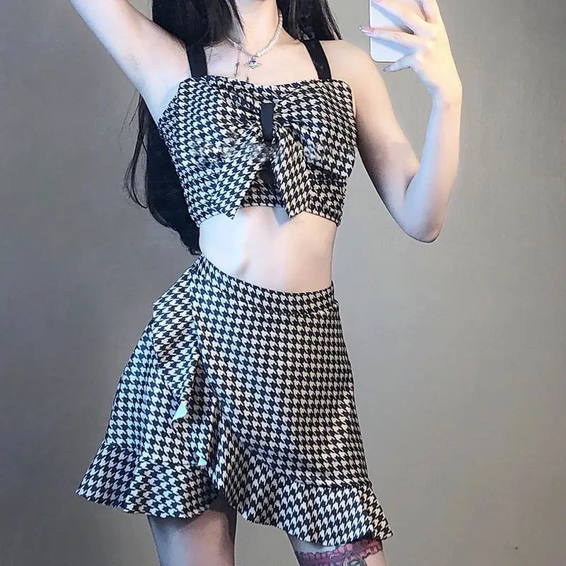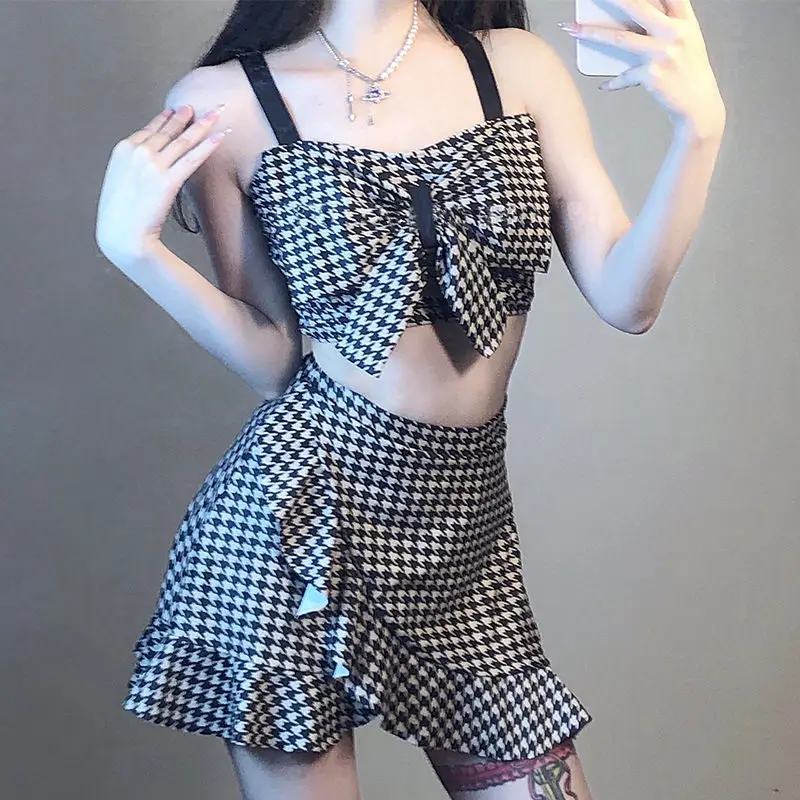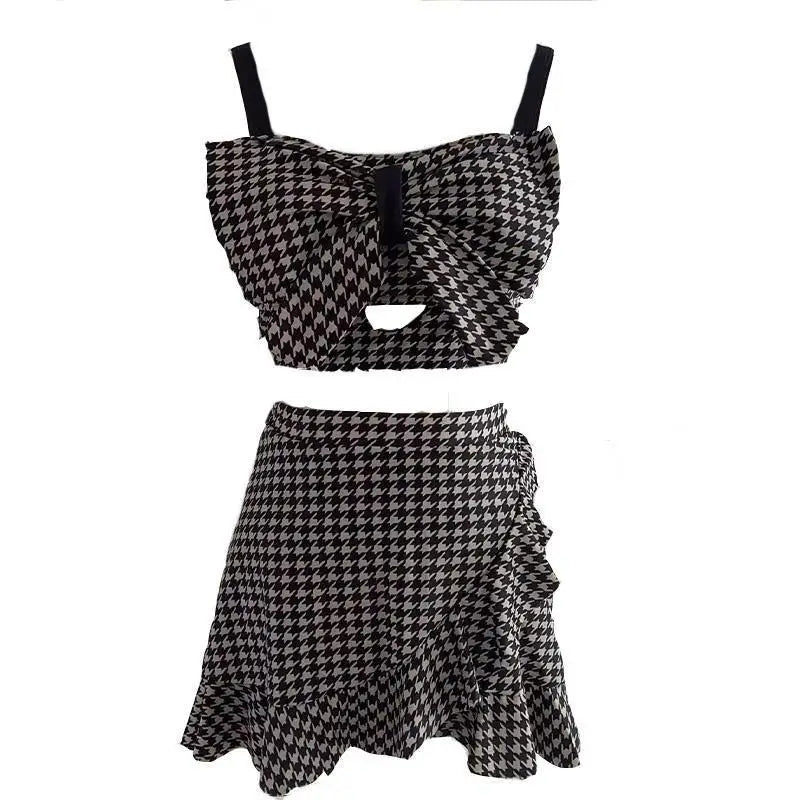 Purpdrank Women Retro Houndstooth Ruffle Bow Sweet Two Piece Swimsuit Y2K Lace-up Adjustable Strap Tankini Set Sexy High Waist Mini Skirt