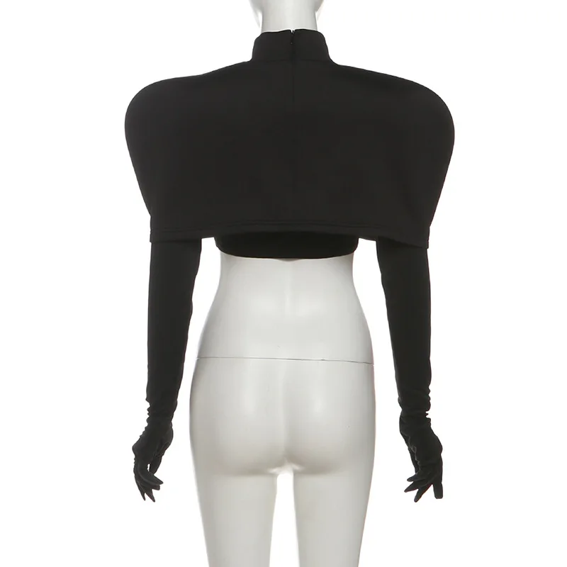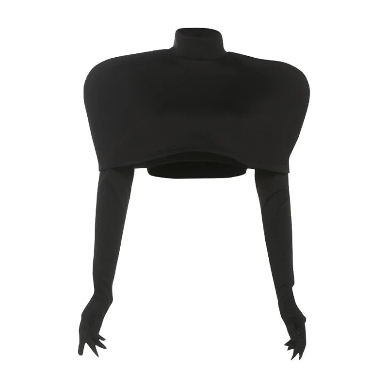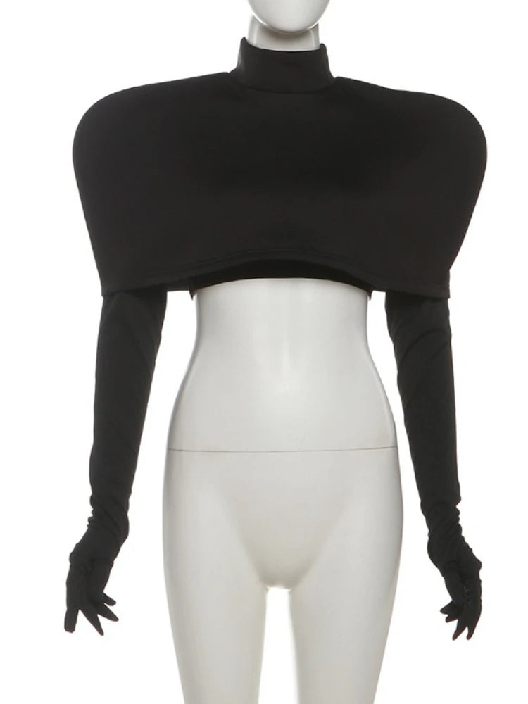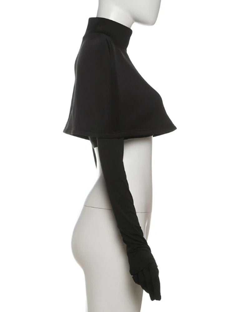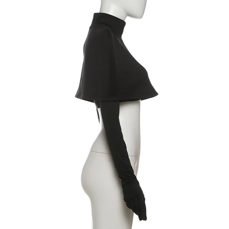 Purpdrank Women's Black O Neck Long Sleeve Crop T-Shirt and Stand Collar Cover Top 2 Piece Set with Gloves Fall Fashion Outfits
