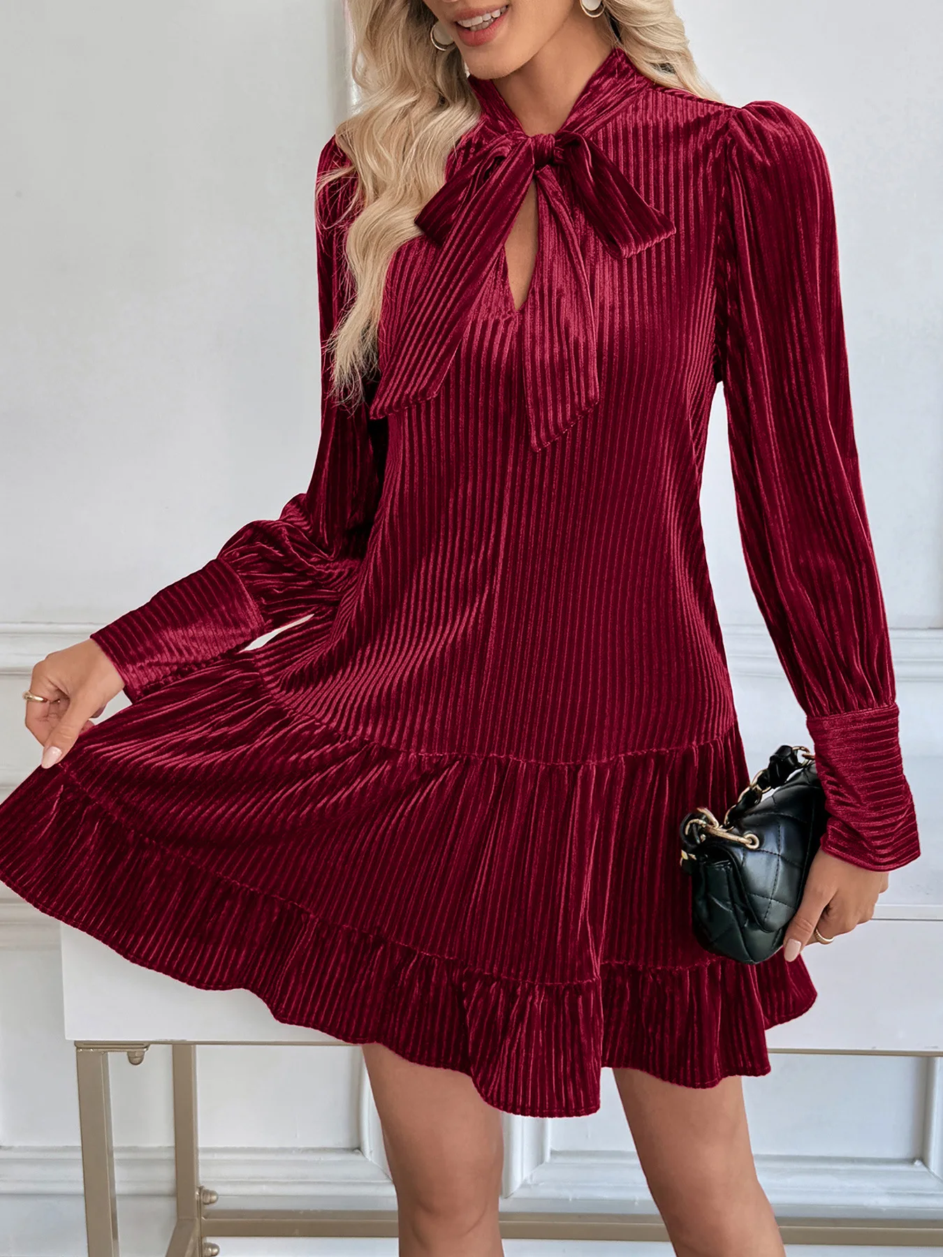Purpdrank Autumn Elegant Temperament Solid V Neck Long Sleeve Patchwork Fashion Dresses