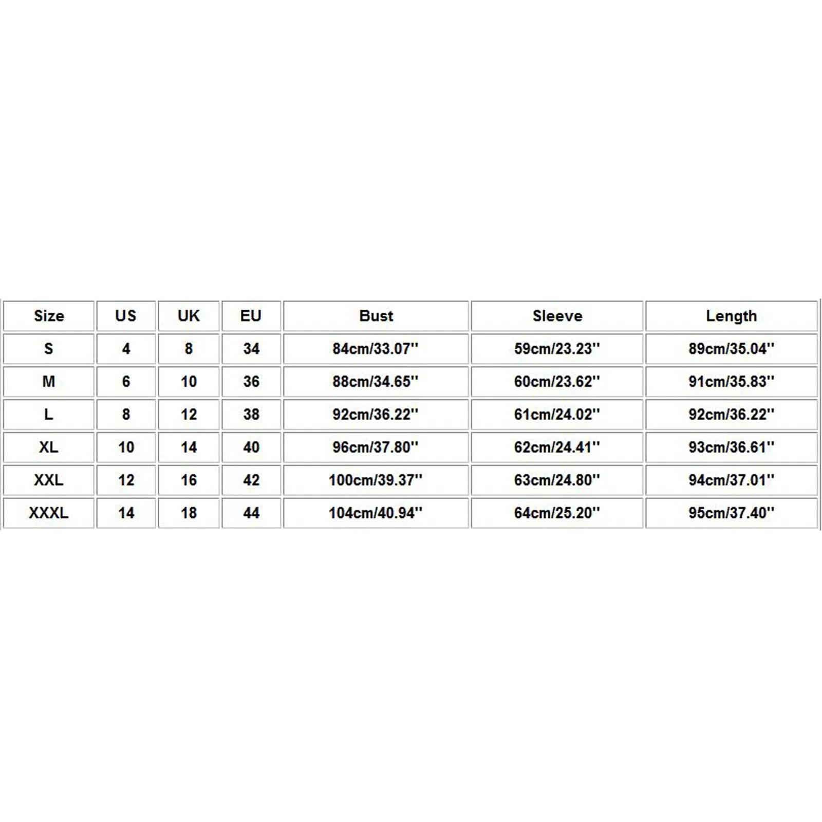 | Size:XXXL | US:14 | UK:18 | EU:44 | Bust:104cm/40.94'' | Sleeve:64cm/25.20'' | Length:95cm/37.40'' |