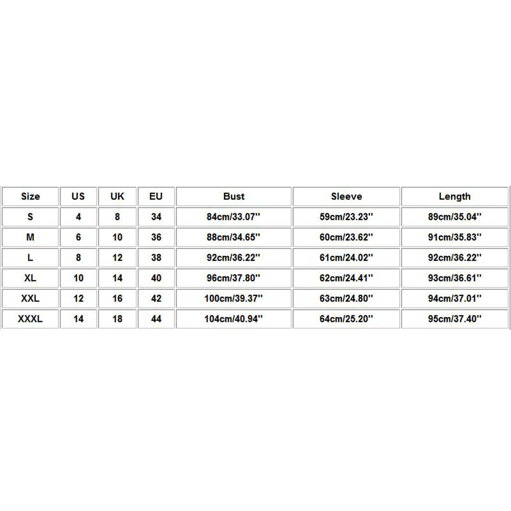 | Size:XL | US:10 | UK:14 | EU:40 | Bust:96cm/37.80'' | Sleeve:62cm/24.41'' | Length:93cm/36.61'' |
