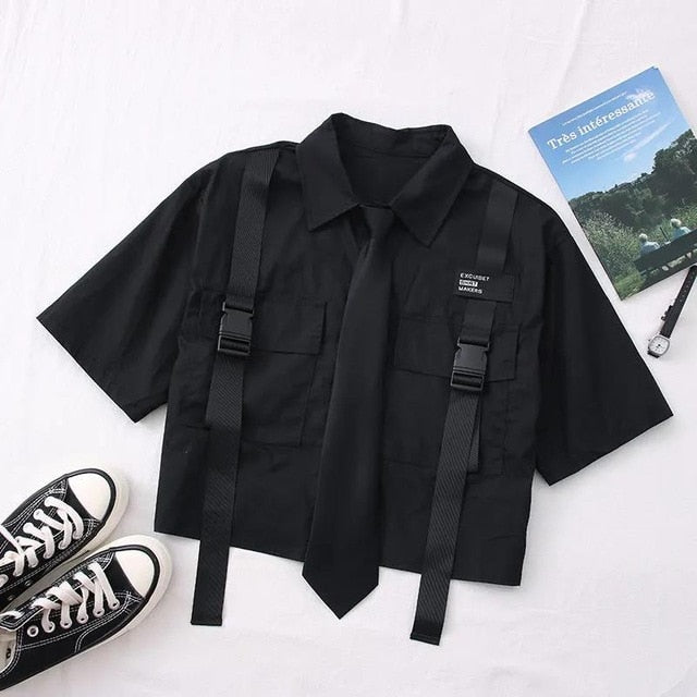 Purpdrank - Autumn Streetwear Pants High-Waist Straight Ribbon Cargo Pants Student Loose Short-Sleeved Shirt with Tie two-piece Set