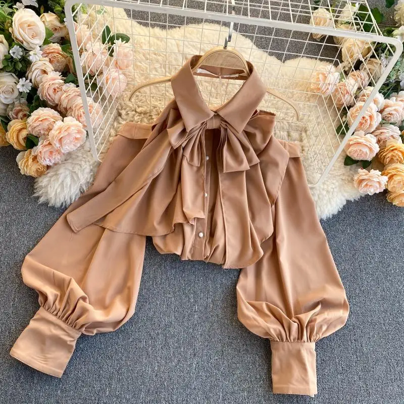 Purpdrank - Spring Autumn New Blouse Women Halter Scheming Halter Shirt Bowknot Lapel Puff Sleeve Female Top C031