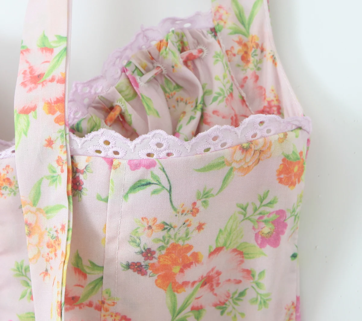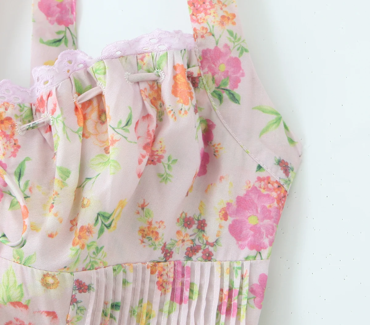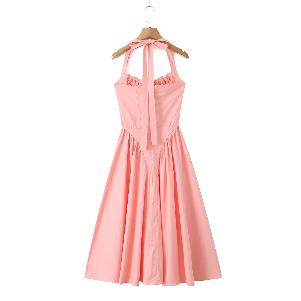 2024 Sexy Pink Corset Style Bow Halter Dress Spliced Lace Drawstring Rope Chest Pleated Slim Low Waist A-lined Swing Midi Robe