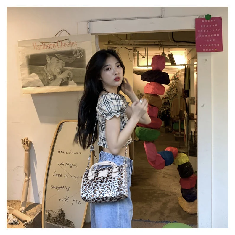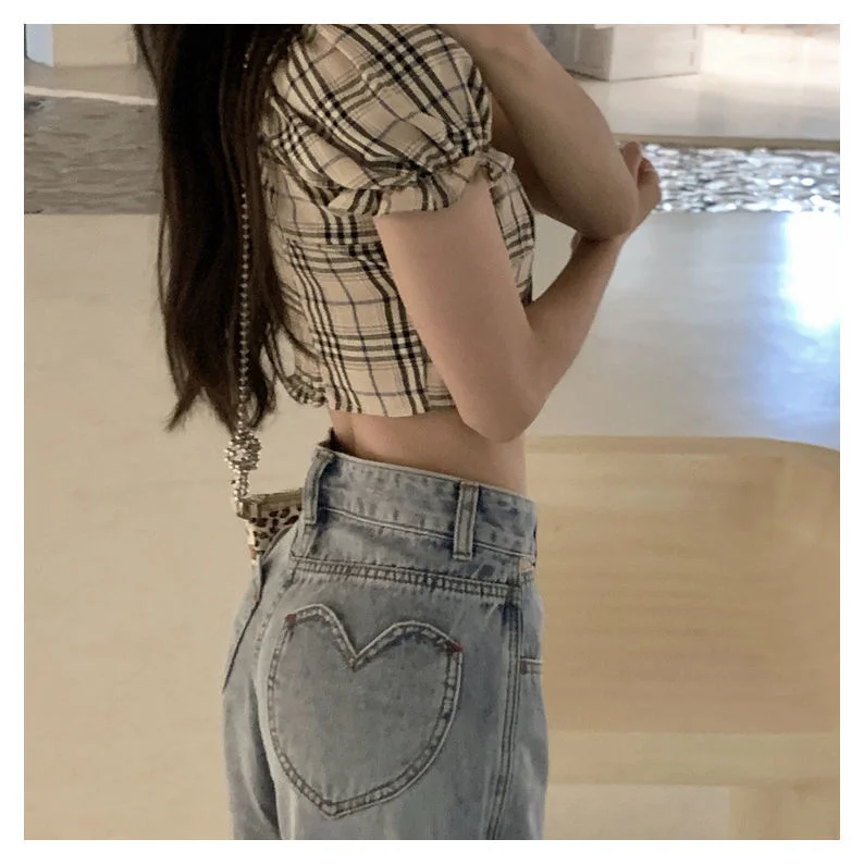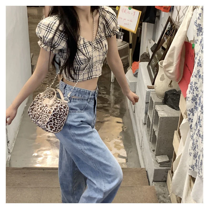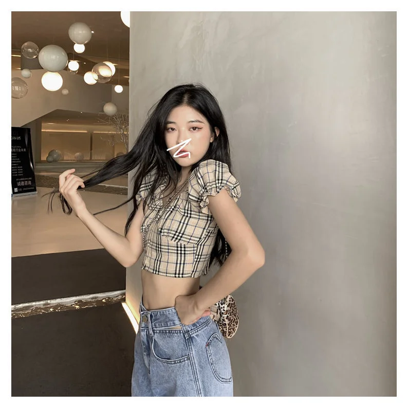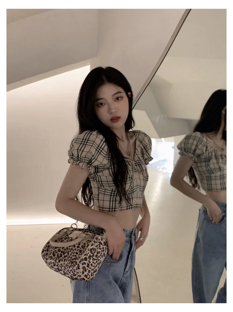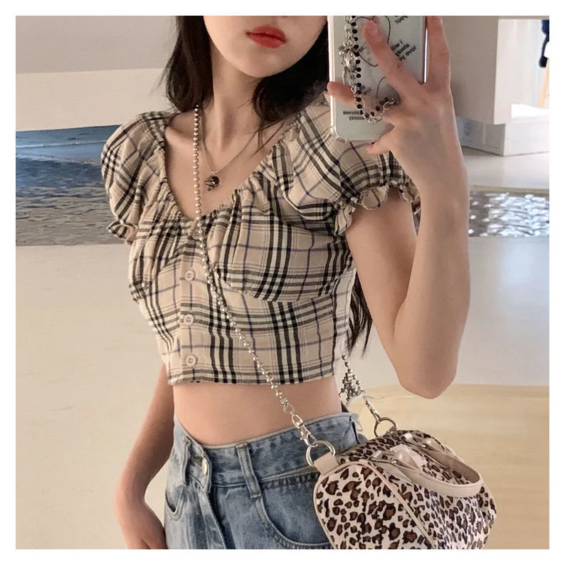 Blouse Women Shirt Plaid Short Shirt Women's Puff Sleeve Short Shirt 2022 Summer Blusas Mujer