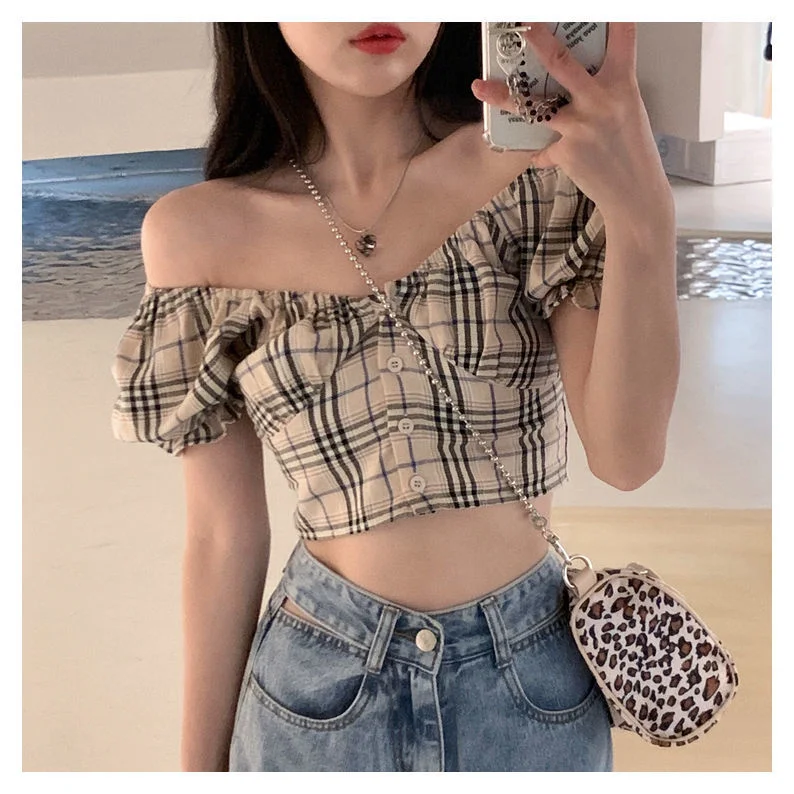 Purpdrank - Blouse Women Shirt Plaid Short Shirt Women's Puff Sleeve Short Shirt Summer Blusas Mujer
